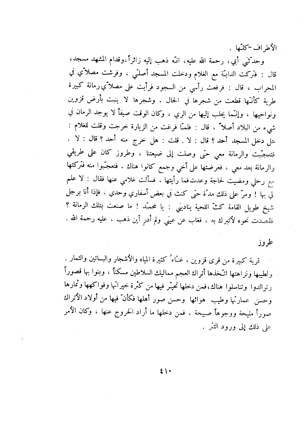 قرية كبيرة من قرى قزوين، غناء كثيرة المياه والأشجار والبساتين والثمار. ولطيبها ونزاهتها اتخذها أتراك العجم مماليك السلاطين مسكناً، وبنوا بها قصوراً وتوالدوا وتناسلوا هناك، فمن دخلها تحير فيها من كثرة خيراتها وفواكهها وثمارها وحسن عمارتها وطيب هوائها وحسن صور أهلها فكأن فيها من أولاد الأتراك صوراً مليحة ووجوهاً صبيحة، فمن دخلها ما أراد الخروج عنها، وكان الأمر على ذلك إلى ورود التتر.