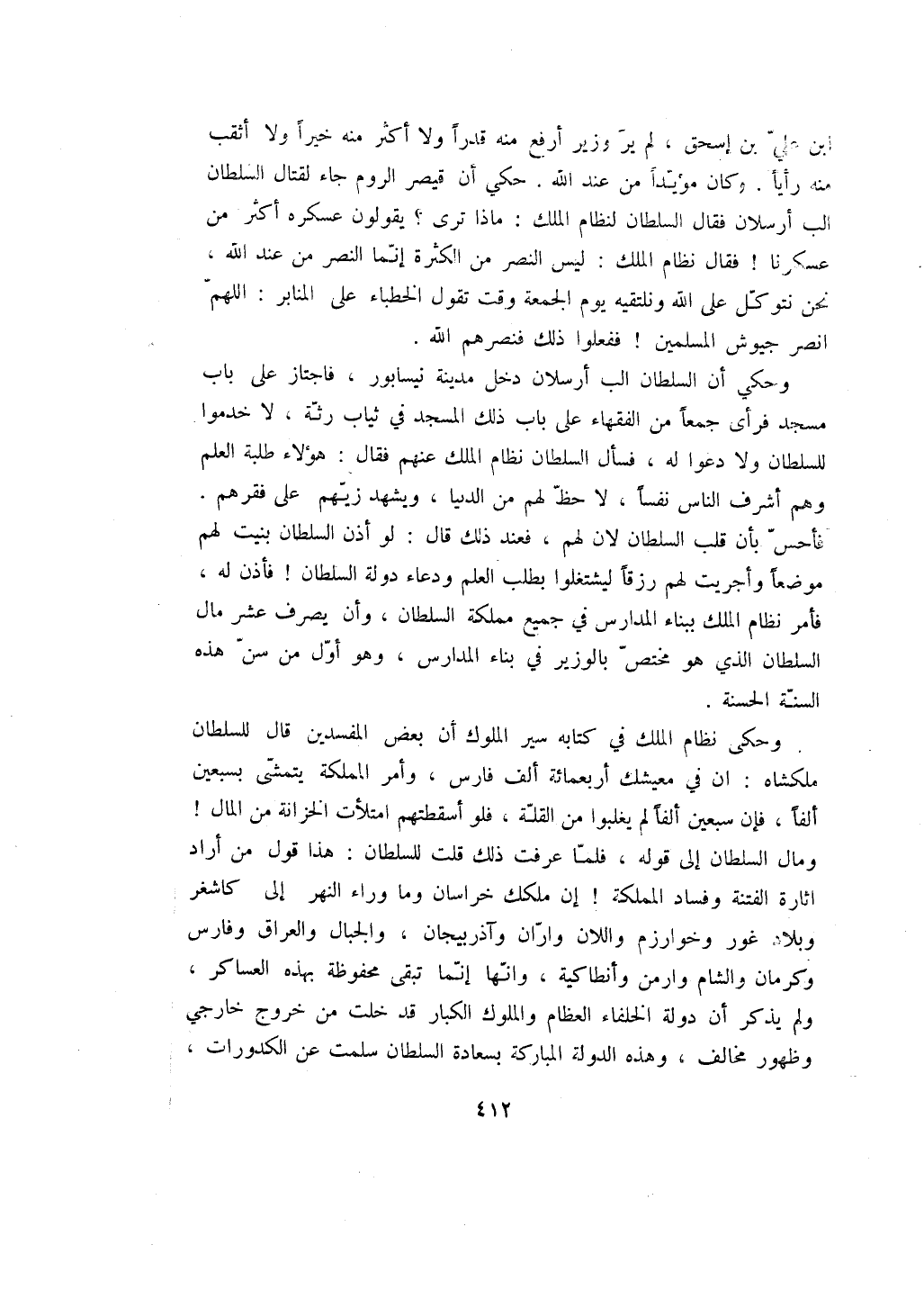 ابن علي بن إسحق، لم ير وزير أرفع منه قدراً ولا أكثر منه خيراً ولا أثقب منه رأياً. وكان مؤيداً من عند الله. حكي أن قيصر الروم جاء لقتال السلطان الب أرسلان فقال السلطان لنظام الملك: ماذا ترى؟ يقولون عسكره أكثر من عسكرنا! فقال نظام الملك: ليس النصر من الكثرة إنما النصر من عند الله، نحن نتوكل على الله ونلتقيه يوم الجمعة وقت تقول الخطباء على المنابر: اللهم انصر جيوش المسلمين! ففعلوا ذلك فنصرهم الله.