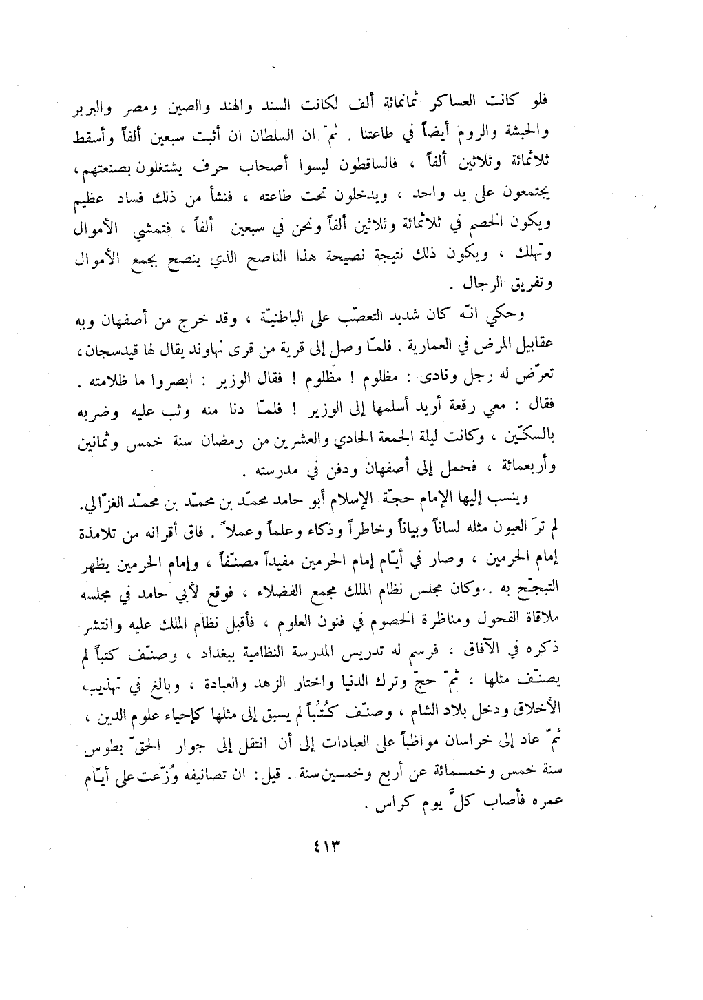 فلو كانت العساكر ثمانمائة ألف لكانت السند والهند والصين ومصر والبربر والحبشة والروم أيضاً في طاعتنا. ثم ان السلطان ان أثبت سبعين ألفاً وأسقط ثلاثمائة وثلاثين ألفاً، فالساقطون ليسوا أصحاب حرف يشتغلون بصنعتهم، يجتمعون على يد واحد، ويدخلون تحت طاعته، فنشأ من ذلك فساد عظيم ويكون الخصم في ثلاثمائة وثلاثين ألفاً ونحن في سبعين ألفاً، فتمشي الأموال وتهلك، ويكون ذلك نتيجة نصيحة هذا الناصح الذي ينصح بجمع الأموال وتفريق الرجال.