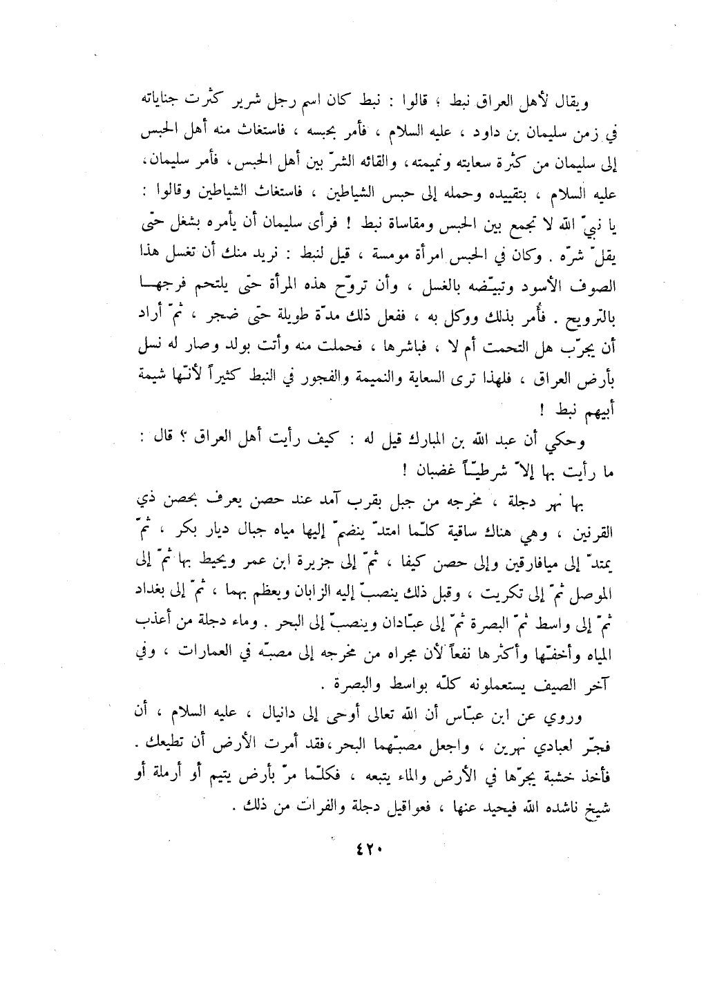ويقال لأهل العراق نبط؛ قالوا: نبط كان اسم رجل شرير كثرت جناياته في زمن سليمان بن داود، عليه السلام، فأمر بحبسه، فاستغاث منه أهل الحبس إلى سليمان من كثرة سعايته ونميمته، والقائه الشر بين أهل الحبس، فأمر سليمان، عليه السلام، بتقييده وحمله إلى حبس الشياطين، فاستغاث الشياطين وقالوا: يا نبي الله لا تجمع بين الحبس ومقاساة نبط! فرأى سليمان أن يأمره بشغل حتى يقل شره. وكان في الحبس امرأة مومسة، قيل لنبط: نريد منك أن تغسل هذا الصوف الأسود وتبيضه بالغسل، وأن تروح هذه المرأة حتى يلتحم فرجها بالترويح، فأمر بذلك ووكل به، ففعل ذلك مدة طويلة حتى ضجر، ثم أراد أن يجرب هل التحمت أم لا، فباشرها، فحملت منه وأتت بولد وصار له نسل بأرض العراق، فلهذا ترى السعاية والنميمة والفجور في النبط كثيراً لأنها شيمة أبيهم نبط! وحكي أن عبد الله بن المبارك قيل له: كيف رأيت أهل العراق؟ قال: ما رأيت بها إلا شرطياً غضبان! بها نهر دجلة، مخرجه من جبل بقرب آمد عند حصن يعرف بحصن ذي القرنين، وهي هناك ساقية كلما امتد ينضم إليها مياه جبال ديار بكر، ثم يمتد إلى ميافارقين وإلى حصن كيفا، ثم إلى جزيرة ابن عمر ويحيط بها ثم إلى الموصل ثم إلى تكريت، وقبل ذلك ينصب إليه الزابان ويعظم بهما، ثم إلى بغداد ثم إلى واسط ثم البصرة ثم إلى عبادان وينصب إلى البحر. وماء دجلة من أعذب المياه وأخفها وأكثرها نفعاً لأن مجراه من مخرجه إلى مصبه في العمارات، وفي آخر الصيف يستعملونه كله بواسط والبصرة.