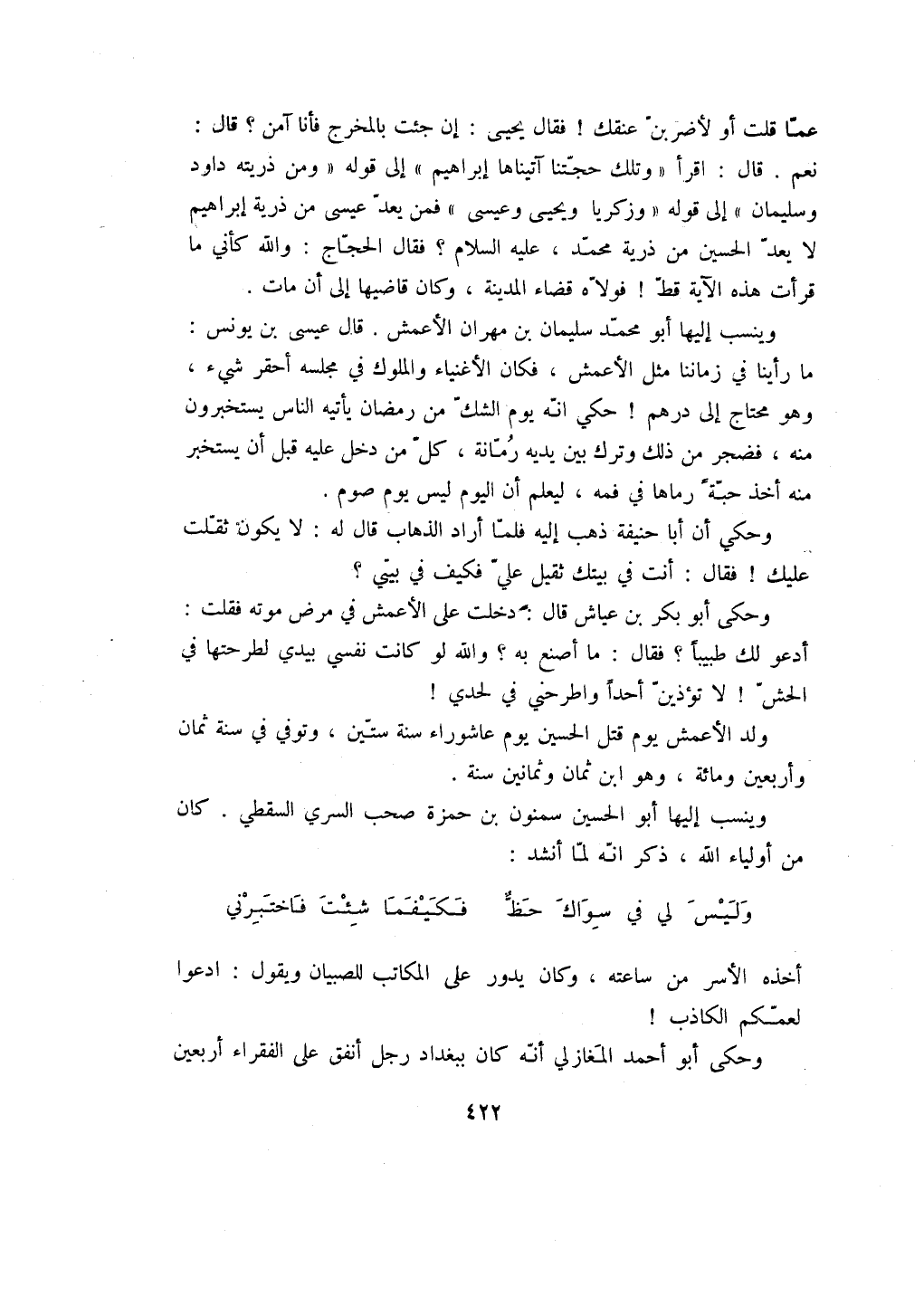 وحكي أن أبا حنيفة ذهب إليه فلما أراد الذهاب قال له: لا يكون ثقلت عليك! فقال: أنت في بيتك ثقيل علي فكيف في بيتي؟ وحكى أبو بكر بن عياش قال: دخلت على الأعمش في مرض موته فقلت: أدعو لك طبيباً؟ فقال: ما أصنع به؟ والله لو كانت نفسي بيدي لطرحتها في الحش! لا تؤذين أحداً واطرحني في لحدي! ولد الأعمش يوم قتل الحسين يوم عاشوراء سنة ستين، وتوفي في سنة ثمان وأربعين ومائة، وهو ابن ثمان وثمانين سنة.