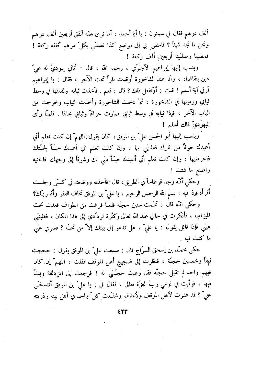 ألف درهم فقال لي سمنون: يا أبا أحمد، أما ترى هذا أنفق أربعين ألف درهم ونحن ما نجد شيئاً؟ فامض بي إلى موضع كذا نصلي بكل درهم أنفقه ركعة! فمضينا وصلينا أربعين ألف ركعة! وينسب إليها إبراهيم الآجري، رحمه الله، قال: أتاني يهودي له علي دين يتقاضاه، وأنا عند الشاخورة أوقدت ناراً تحت الآجر، فقال: يا إبراهيم أرني آية أسلم! قلت: أوتفعل ذلك؟ قال: نعم. فأخذت ثيابه ولففتها في وسط ثيابي ورميتها في الشاخورة، ثم دخلت الشاخورة وأخذت الثياب وخرجت من الباب الآخر، فإذا ثيابه في وسط ثيابي صارت حراقاً وثيابي بحالها. فلما رأى اليهودي ذلك أسلم!