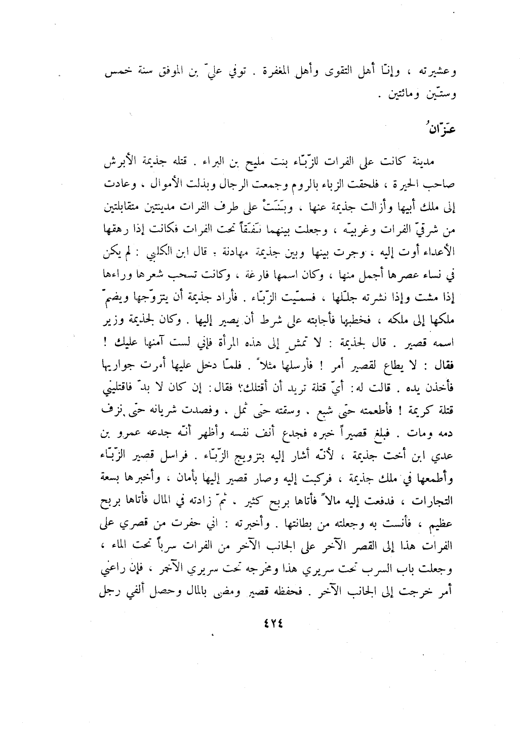 مدينة كانت على الفرات للزباء بنت مليح بن البراء. قتله جذيمة الأبرش صاحب الحيرة، فلحقت الزباء بالروم وجمعت الرجال وبذلت الأموال، وعادت إلى ملك أبيها وأزالت جذيمة عنها، وبنت على طرف الفرات مدينتين متقابلتين من شرقي الفرات وغربيه، وجعلت بينهما نفقاً تحت الفرات فكانت إذا رهقها الأعداء أوت إليه، وجرت بينها وبين جذيمة مهادنة؛ قال ابن الكلبي: لم يكن في نساء عصرها أجمل منها، وكان اسمها فارغة، وكانت تسحب شعرها وراءها إذا مشت وإذا نشرته جللها، فسميت الزباء. فأراد جذيمة أن يتزوجها ويضم ملكها إلى ملكه، فخطبها فأجابته على شرط أن يصير إليها. وكان لجذيمة وزير اسمه قصير. قال لجذيمة: لا تمش إلى هذه المرأة فإني لست آمنها عليك! فقال: لا يطاع لقصير أمر! فأرسلها مثلاً. فلما دخل عليها أمرت جواريها فأخذن يده. قالت له: أي قتلة تريد أن أقتلك؟ فقال: إن كان لا بد فاقتليني قتلة كريمة! فأطعمته حتى شبع، وسقته حتى ثمل، وفصدت شريانه حتى نزف دمه ومات. فبلغ قصيراً خبره فجدع أنف نفسه وأظهر أنه جدعه عمرو بن عدي ابن أخت جذيمة، لأنه أشار إليه بتزويج الزباء. فراسل قصير الزباء وأطمعها في ملك جذيمة، فركبت إليه وصار قصير إليها بأمان، وأخبرها بسعة التجارات، فدفعت إليه مالاً فأتاها بربح كثير، ثم زادته في المال فأتاها بربح عظيم، فأنست به وجعلته من بطانتها. وأخبرته: اني حفرت من قصري على الفرات هذا إلى القصر الآخر على الجانب الآخر من الفرات سرباً تحت الماء، وجعلت باب السرب تحت سريري هذا ومخرجه تحت سريري الآخر، فإن راعني أمر خرجت إلى الجانب الآخر. فحفظه قصير ومضى بالمال وحصل ألفي رجل