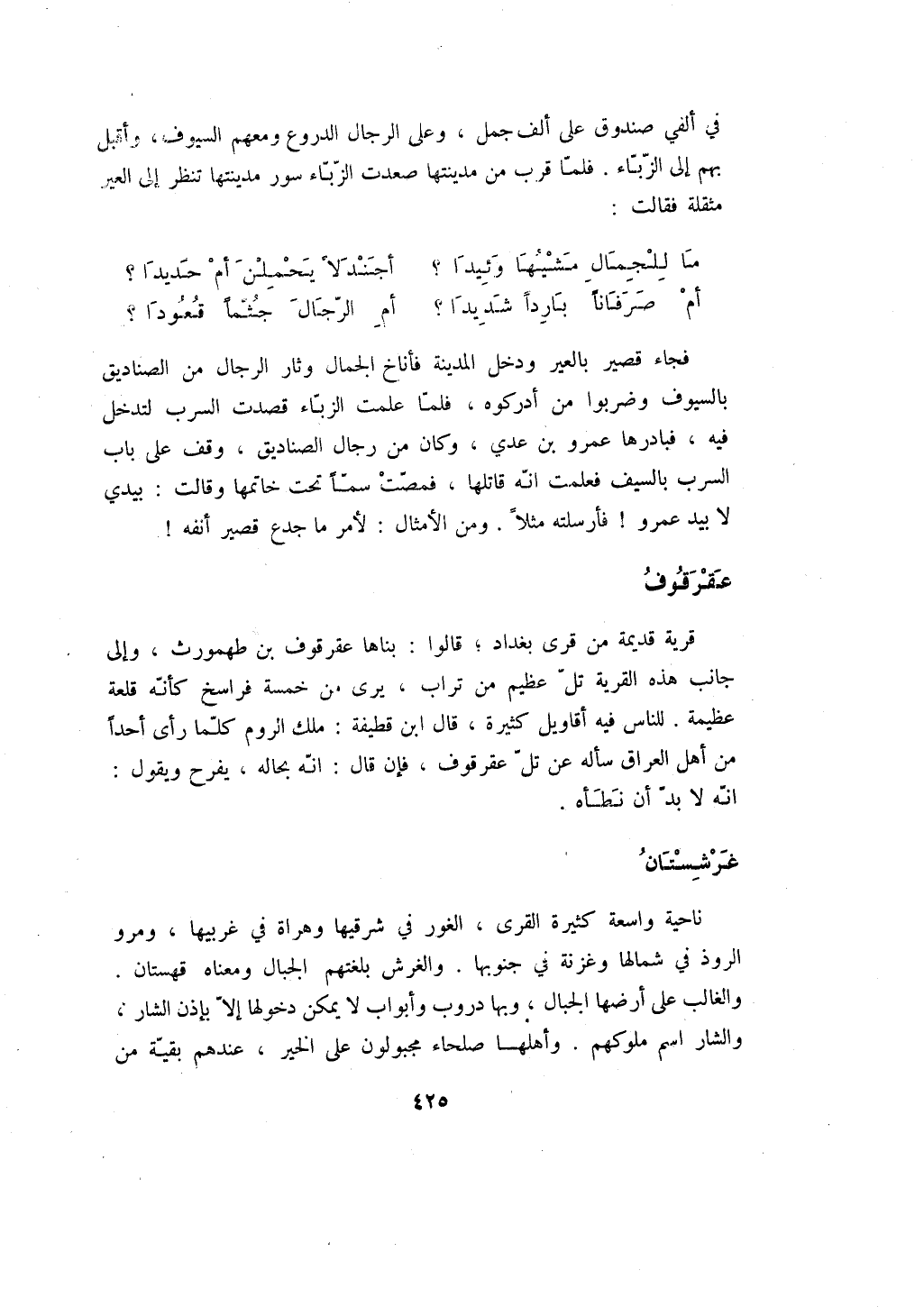قرية قديمة من قرى بغداد؛ قالوا: بناها عقرقوف بن طهمورث، وإلى جانب هذه القرية تل عظيم من تراب، يرى من خمسة فراسخ كأنه قلعة عظيمة. للناس فيه أقاويل كثيرة، قال ابن قطيفة: ملك الروم كلما رأى أحداً من أهل العراق سأله عن تل عقرقوف، فإن قال: انه بحاله، يفرح ويقول: انه لا بد أن نطأه.