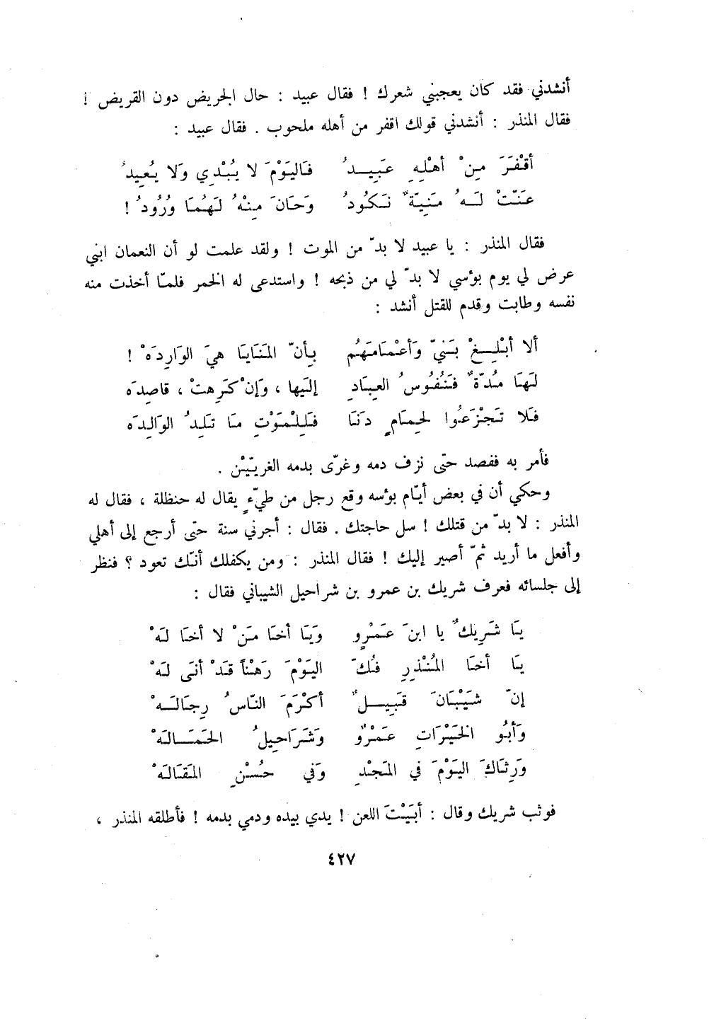 فقال المنذر: يا عبيد لا بد من الموت! ولقد علمت لو أن النعمان ابني عرض لي يوم بؤسي لا بد لي من ذبحه! واستدعى له الخمر فلما أخذت منه نفسه وطابت وقدم للقتل أنشد.