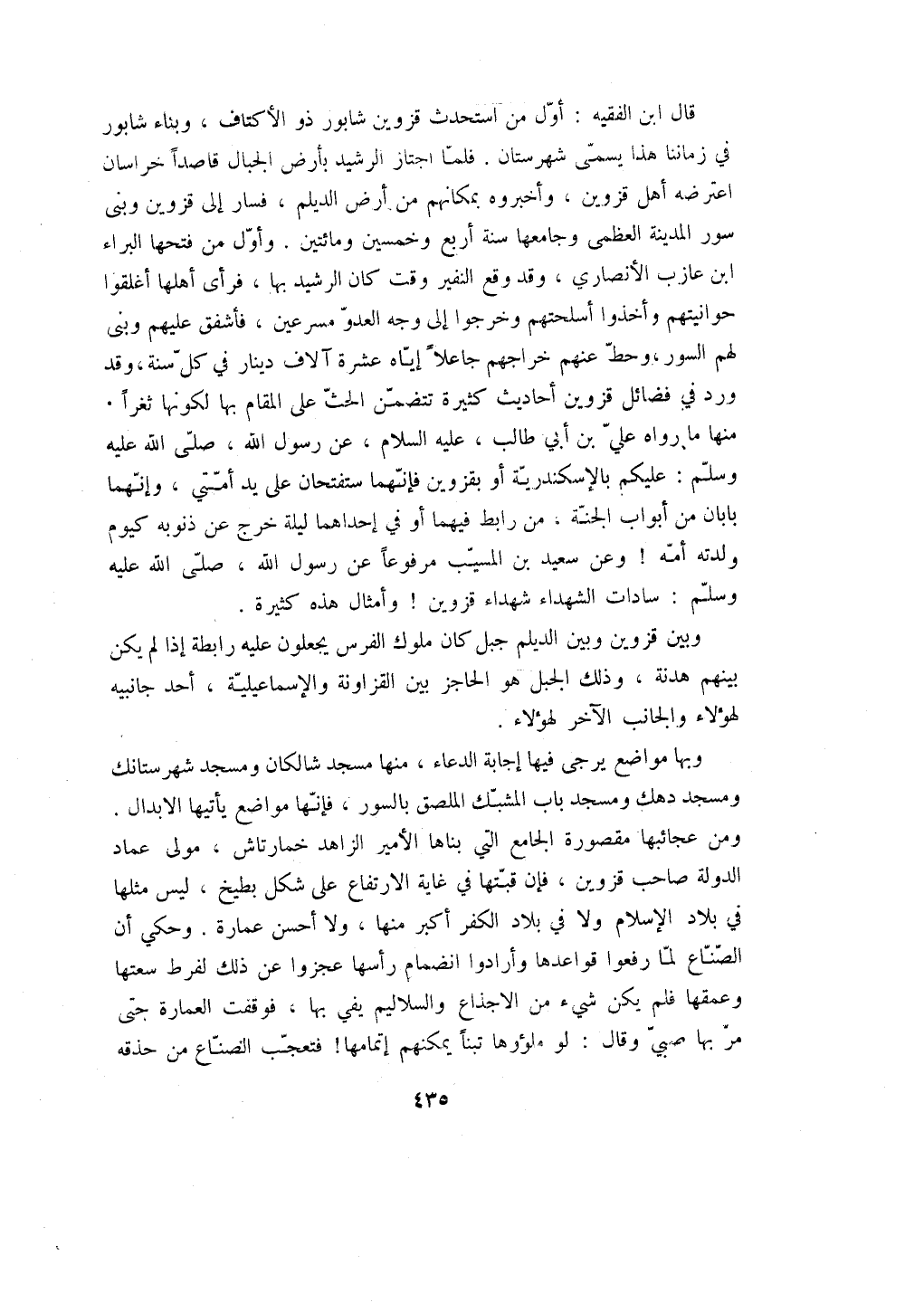 قال ابن الفقيه: أول من استحدث قزوين شابور ذو الأكتاف، وبناء شابور في زماننا هذا يسمى شهرستان. فلما اجتاز الرشيد بأرض الجبال قاصداً خراسان اعترضه أهل قزوين، وأخبروه بمكانهم من أرض الديلم، فسار إلى قزوين وبنى سور المدينة العظمى وجامعها سنة أربع وخمسين ومائتين. وأول من فتحها البراء ابن عازب الأنصاري، وقد وقع النفير وقت كان الرشيد بها، فرأى أهلها أغلقوا حوانيتهم وأخذوا أسلحتهم وخرجوا إلى وجه العدو مسرعين، فأشفق عليهم وبنى لهم السور، وحط عنهم خراجهم جاعلاً إياه عشرة آلاف دينار في كل سنة، وقد ورد في فضائل قزوين أحاديث كثيرة تتضمن الحث على المقام بها لكونها ثغراً. منها ما رواه علي بن أبي طالب، عليه السلام، عن رسول الله، صلى الله عليه وسلم: عليكم بالإسكندرية أو بقزوين فإنهما ستفتحان على يد أمتي، وإنهما بابان من أبواب الجنة، من رابط فيهما أو في إحداهما ليلة خرج عن ذنوبه كيوم ولدته أمه! وعن سعيد بن المسيب مرفوعاً عن رسول الله، صلى الله عليه وسلم: سادات الشهداء شهداء قزوين! وأمثال هذه كثيرة.