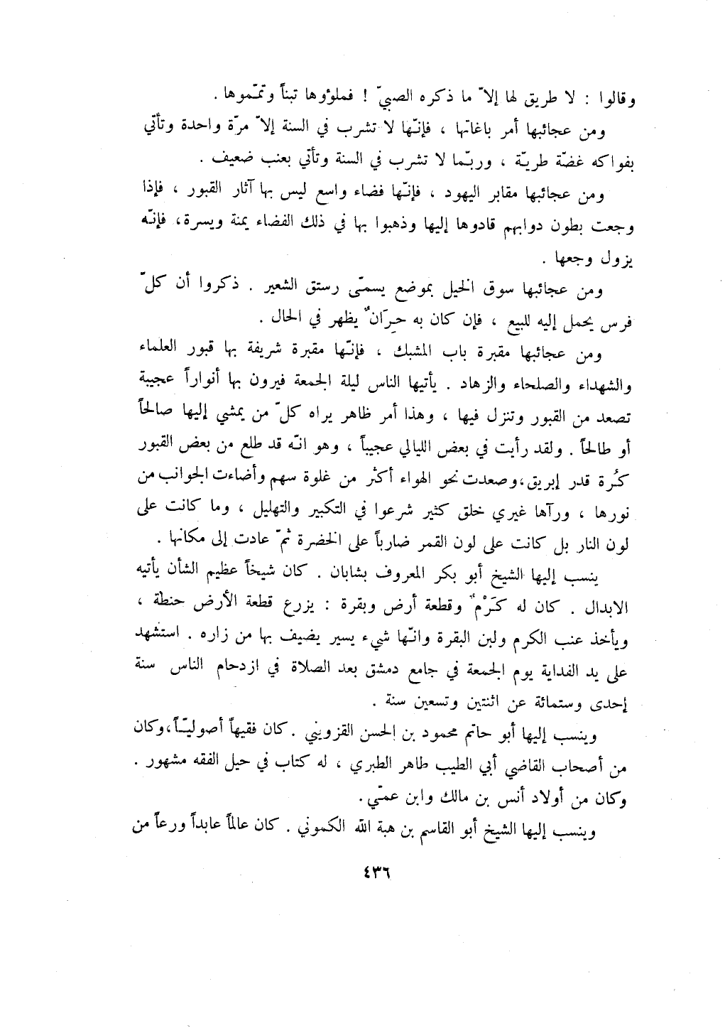ومن عجائبها مقبرة باب المشبك، فإنها مقبرة شريفة بها قبور العلماء والشهداء والصلحاء والزهاد. يأتيها الناس ليلة الجمعة فيرون بها أنواراً عجيبة تصعد من القبور وتنزل فيها، وهذا أمر ظاهر يراه كل من يمشي إليها صالحاً أو طالحاً. ولقد رأيت في بعض الليالي عجيباً، وهو انه قد طلع من بعض القبور كرة قدر إبريق، وصعدت نحو الهواء أكثر من غلوة سهم وأضاءت الجوانب من نورها، ورآها غيري خلق كثير شرعوا في التكبير والتهليل، وما كانت على لون النار بل كانت على لون القمر ضارباً على الخضرة ثم عادت إلى مكانها.