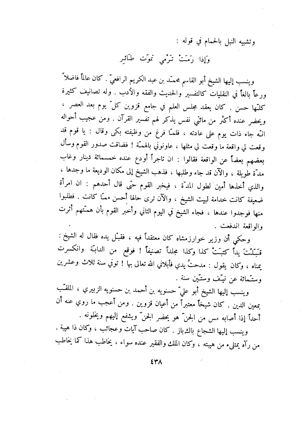 وينسب إليها الشيخ أبو القاسم محمد بن عبد الكريم الرافعي. كان عالماً فاضلاً ورعاً بالغاً في النقليات كالتفسير والحديث والفقه والأدب. وله تصانيف كثيرة كلها حسن. كان يعقد مجلس العلم في جامع قزوين كل يوم بعد العصر، ويحضر عنده أكثر من مائتي نفس يذكر لهم تفسير القرآن. ومن عجيب أحواله انه جاء ذات يوم على عادته، فلما فرغ من وظيفته بكى وقال: يا قوم قد وقعت لي واقعة ما وقعت لي مثلها، عاونوني بالهمة! فضاقت صدور القوم وسأل بعضهم بعضاً عن الواقعة فقالوا: ان تاجراً أودع عنده خمسمائة دينار وغاب مدة طويلة، والآن قد جاء وطلبها، فذهب الشيخ إلى مكان الوديعة ما وجدها، والذي أخذها أمين لطول المدة، فيخبر القوم حتى قال أحدهم: ان امرأة ضعيفة كانت خدامة لبيت الشيخ، والآن ترى حالها أحسن مما كانت. فطلبوا منها فوجدوا عندها، فجاء الشيخ في اليوم الثاني وأخبر القوم بأن همتهم أثرت والواقعة اندفعت.