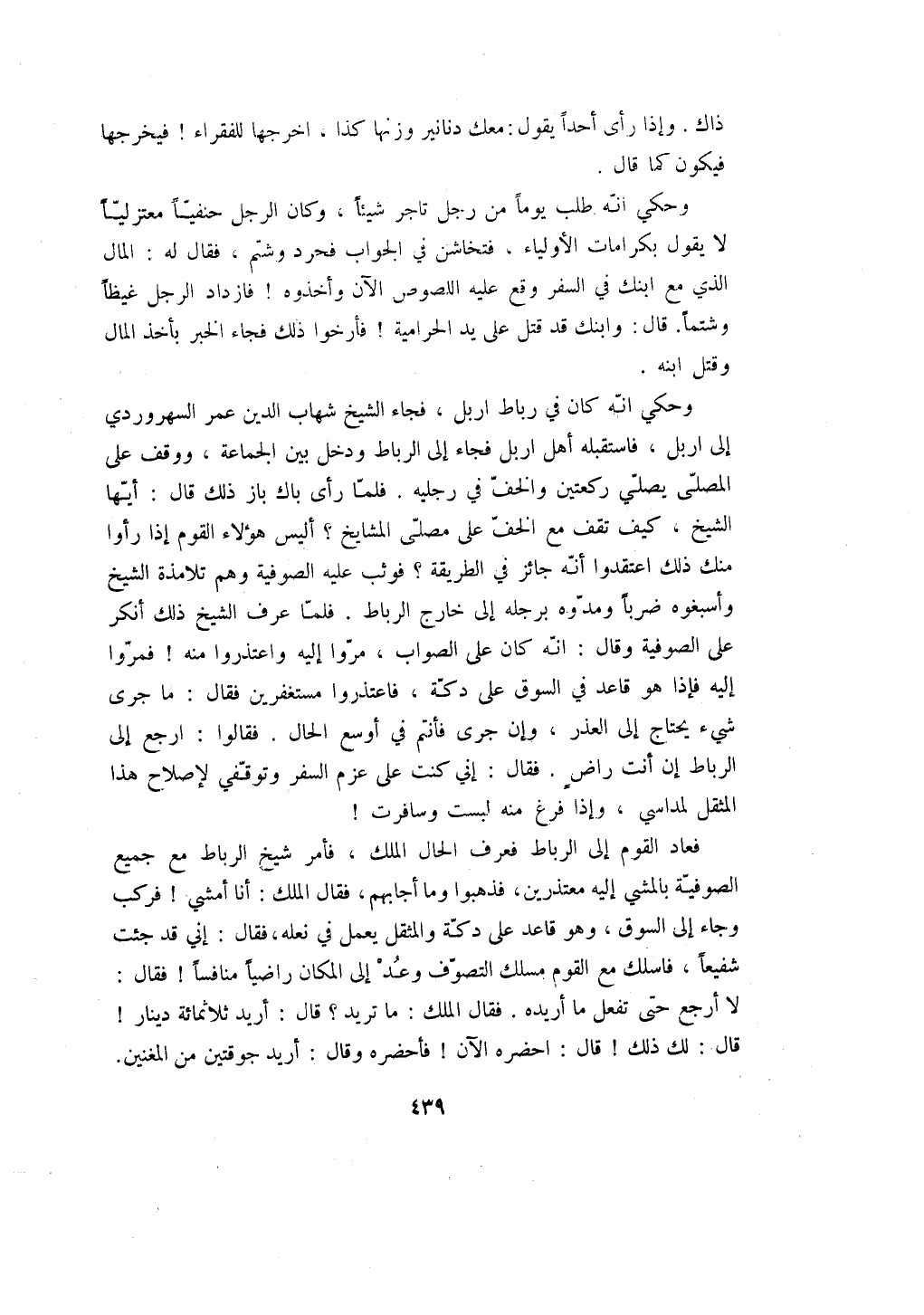 وحكي انه طلب يوماً من رجل تاجر شيئاً، وكان الرجل حنفياً معتزلياً لا يقول بكرامات الأولياء، فتخاشن في الجواب فحرد وشتم، فقال له: المال الذي مع ابنك في السفر وقع عليه اللصوص الآن وأخذوه! فازداد الرجل غيظاً وشتماً. قال: وابنك قد قتل على يد الحرامية! فأرخوا ذلك فجاء الخبر بأخذ المال وقتل ابنه.