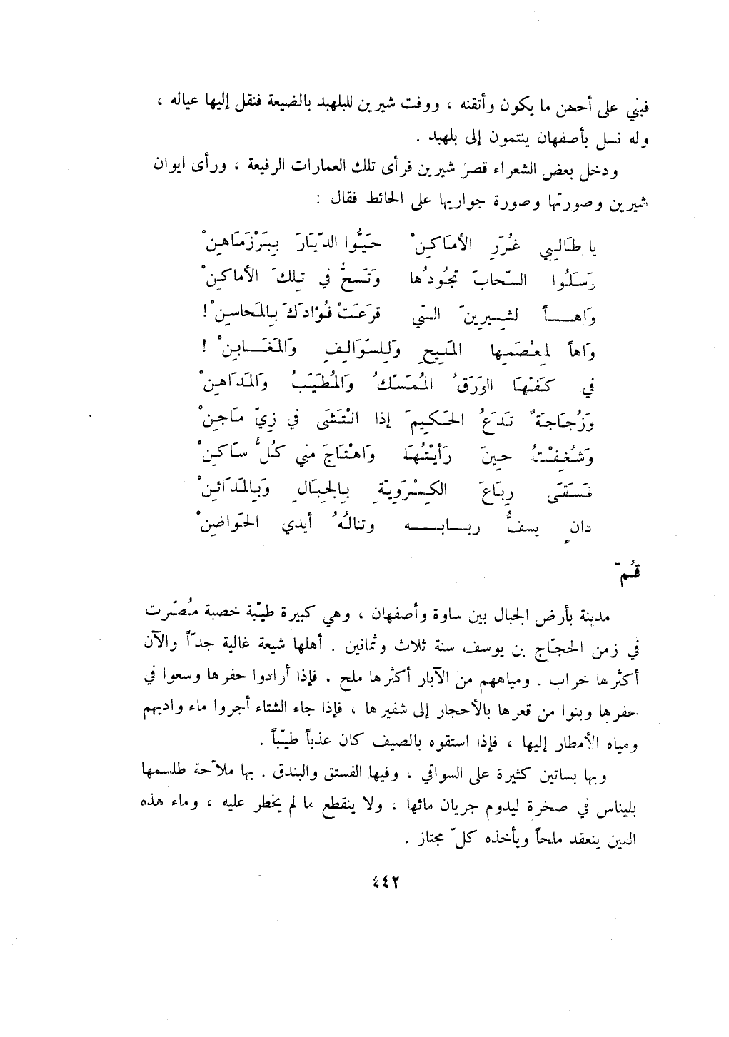 مدينة بأرض الجبال بين ساوة وأصفهان، وهي كبيرة طيبة خصبة مصرت في زمن الحجاج بن يوسف سنة ثلاث وثمانين. أهلها شيعة غالية جداً والآن أكثرها خراب. ومياههم من الآبار أكثرها ملح، فإذا أرادوا حفرها وسعوا في حفرها وبنوا من قعرها بالأحجار إلى شفيرها، فإذا جاء الشتاء أجروا ماء واديهم ومياه الأمطار إليها، فإذا استقوه بالصيف كان عذباً طيباً.