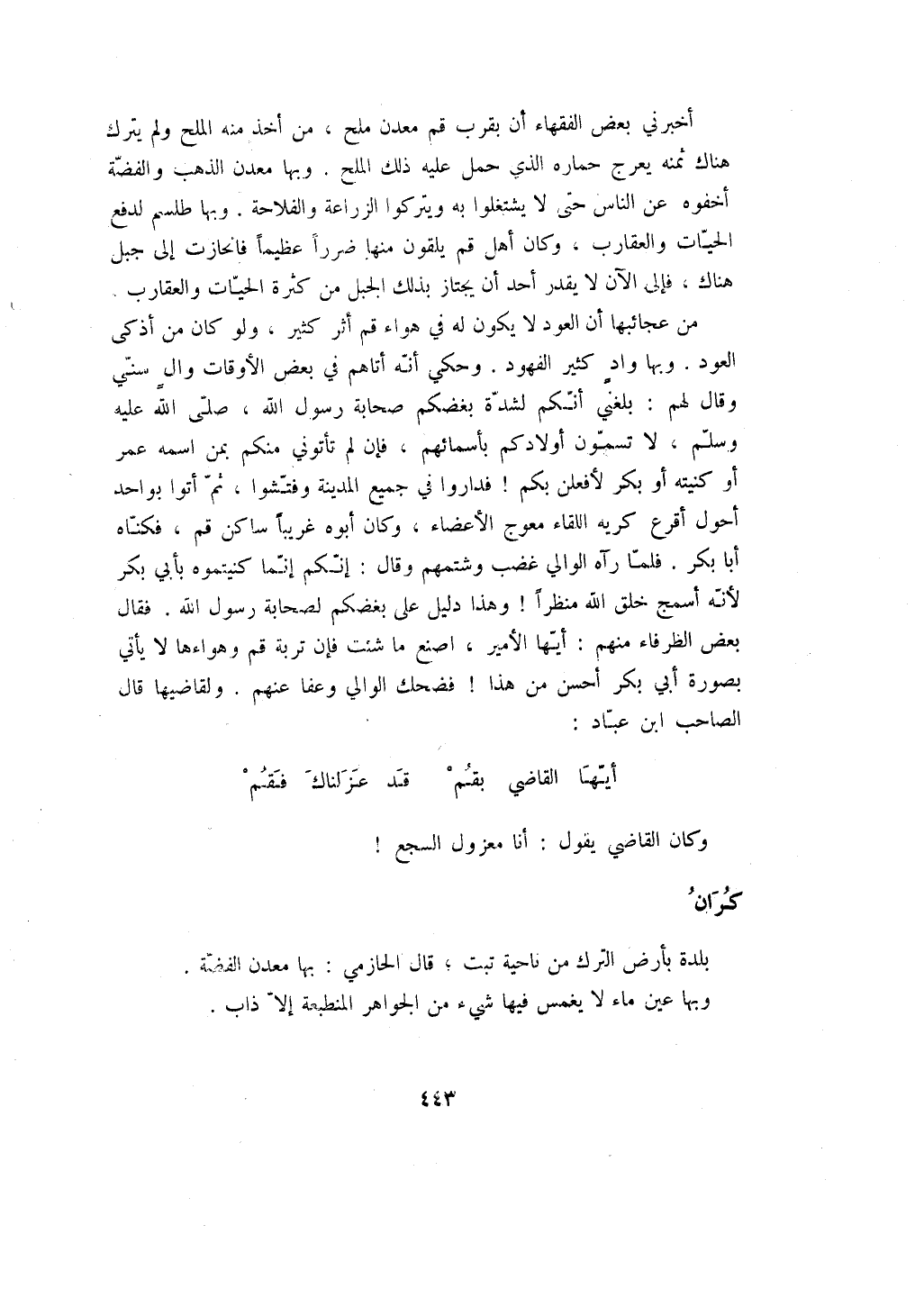 أخبرني بعض الفقهاء أن بقرب قم معدن ملح، من أخذ منه الملح ولم يترك هناك ثمنه يعرج حماره الذي حمل عليه ذلك الملح. وبها معدن الذهب والفضة أخفوه عن الناس حتى لا يشتغلوا به ويتركوا الزراعة والفلاحة. وبها طلسم لدفع الحيات والعقارب، وكان أهل قم يلقون منها ضرراً عظيماً فانحازت إلى جبل هناك، فإلى الآن لا يقدر أحد أن يجتاز بذلك الجبل من كثرة الحيات والعقارب.