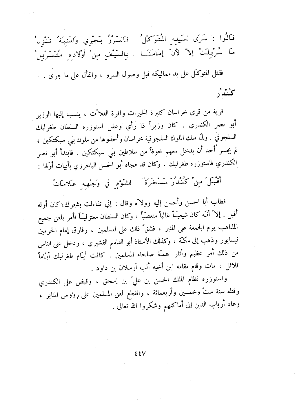 واستوزره نظام الملك الحسن بن علي بن إسحق، وقبض على الكندري وقتله سنة ست وخمسين وأربعمائة، وانقطع لعن المسلمين على رؤوس المنابر، وعاد أرباب الدين إلى أماكنهم وشكروا الله تعالى.