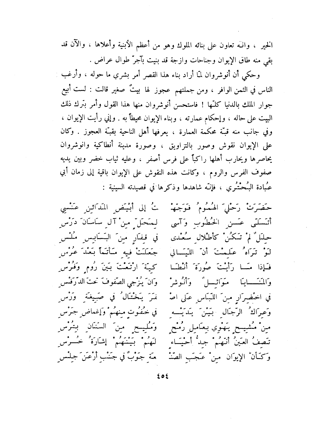 الخير، وانه تعاون على بنائه الملوك وهو من أعظم الأبنية وأعلاها، والآن قد بقي منه طاق الإيوان وجناحات وازجة قد بنيت بآجر طوال عراض.