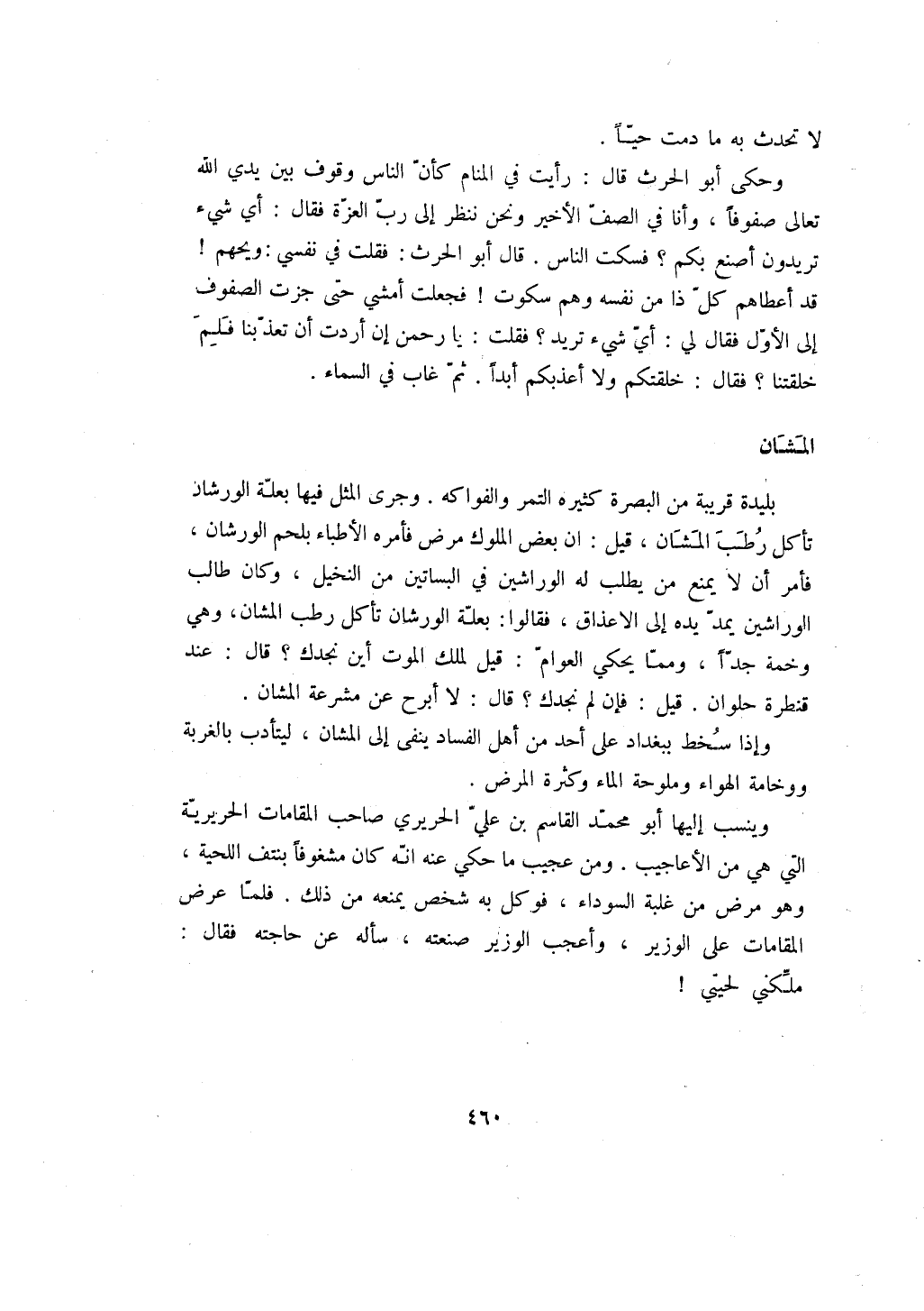 وإذا سخط ببغداد على أحد من أهل الفساد ينفى إلى المشان، ليتأدب بالغربة ووخامة الهواء وملوحة الماء وكثرة المرض.