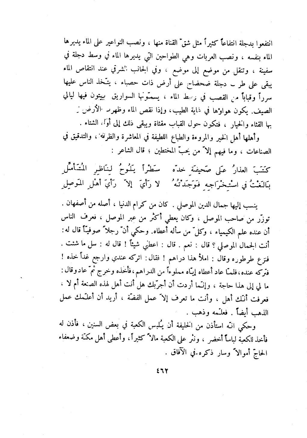 ينسب إليها جمال الدين الموصلي. كان من كرام الدنيا، أصله من أصفهان. توزر من صاحب الموصل، وكان يعطي أكثر من عبر الموصل، فعرف الناس أن عنده الكيمياء، وكل من سأله أعطاه. وحكي أن رجلاً صوفياً قال له: أنت الجمال الموصلي؟ قال: نعم. قال: اعطني شيئاً! قال له: سل ما شئت. فنزع طرطوره وقال: املأ هذا دراهم! فقال: اتركه عندي وارجع غداً خذه! فتركه عنده، فلما عاد أعطاه إياه مملوءاً من الدراهم، فأخذه وخرج ثم عاد وقال: ما لي إلى هذا حاجة، وإنما أردت أن أجربك هل أنت أهل لهذه الصنعة أم لا، فعرفت أنك أهل، وأنت ما تعرف إلا عمل الفضة، أريد أن أعلمك عمل الذهب أيضاً. فعلمه وذهب.