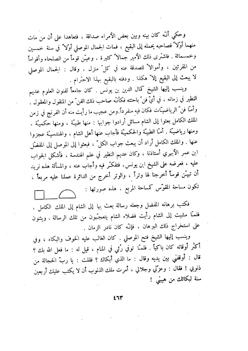 وينسب إليها الشيخ كمال الدين بن يونس. كان جامعاً لفنون العلوم عديم النظير في زمانه، في أي فن باحثته فكأنه صاحب ذلك الفن من المنقول والمعقول. وأما فن الرياضيات فكان فيه منفرداً. ومن عجيب ما رأيت منه أن الفرنج في زمن الملك الكامل بعثوا إلى الشام مسائل ارادوا جوابها: منها طبية، ومنها حكمية، ومنها رياضية. أما الطبية والحكمية فأجاب عنها أهل الشام، والهندسية عجزوا عنها. والملك الكامل أراد أن يبعث جواب الكل، فبعثوا إلى الموصل إلى المفضل ابن عمر الأبهري أستاذنا، وكان عديم النظير في علم الهندسة، فأشكل الجواب عليه، فعرضه على الشيخ ابن يونس، فتفكر فيه وأجاب عنه، والمسألة هذه نريد أن تبين قوساً أخرجنا لها وتراً، والوتر أخرج من الدائرة عملنا عليه مربعاً، تكون مساحة المقوس كمساحة المربع، هذه صورتها: فكتب برهانه المفضل وجعله رسالة بعث بها إلى الشام إلى الملك الكامل، فلما مشيت إلى الشام رأيت فضلاء الشام يتعجبون من تلك الرسالة، ويثنون على استخراج ذلك البرهان، فإنه كان نادر الزمان.