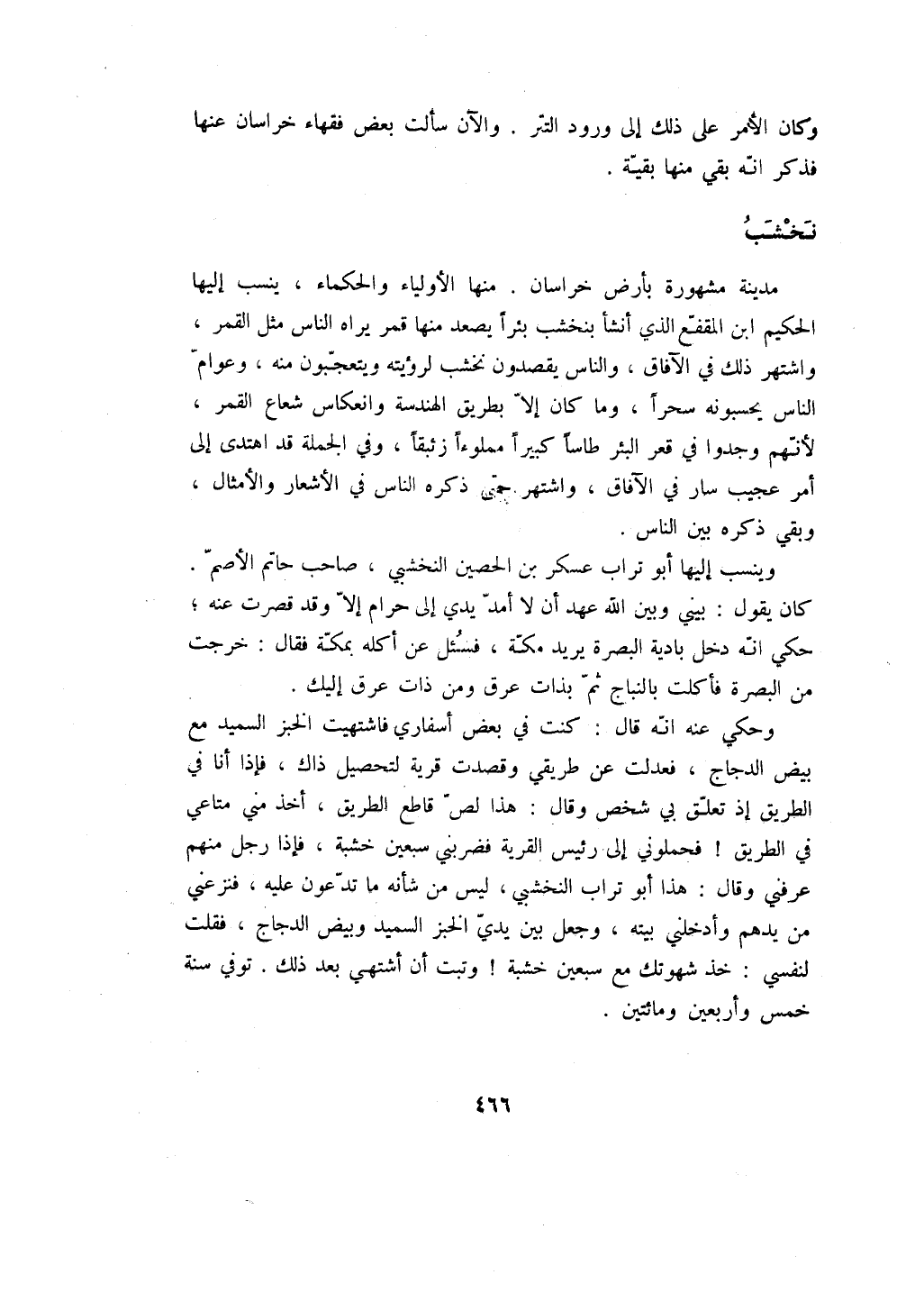 مدينة مشهورة بأرض خراسان. منها الأولياء والحكماء، ينسب إليها الحكيم ابن المقفع الذي أنشأ بنخشب بئراً يصعد منها قمر يراه الناس مثل القمر، واشتهر ذلك في الآفاق، والناس يقصدون نخشب لرؤيته ويتعجبون منه، وعوام الناس يحسبونه سحراً، وما كان إلا بطريق الهندسة وانعكاس شعاع القمر، لأنهم وجدوا في قعر البئر طاساً كبيراً مملوءاً زئبقاً، وفي الجملة قد اهتدى إلى أمر عجيب سار في الآفاق، واشتهر حتى ذكره الناس في الأشعار والأمثال، وبقي ذكره بين الناس.