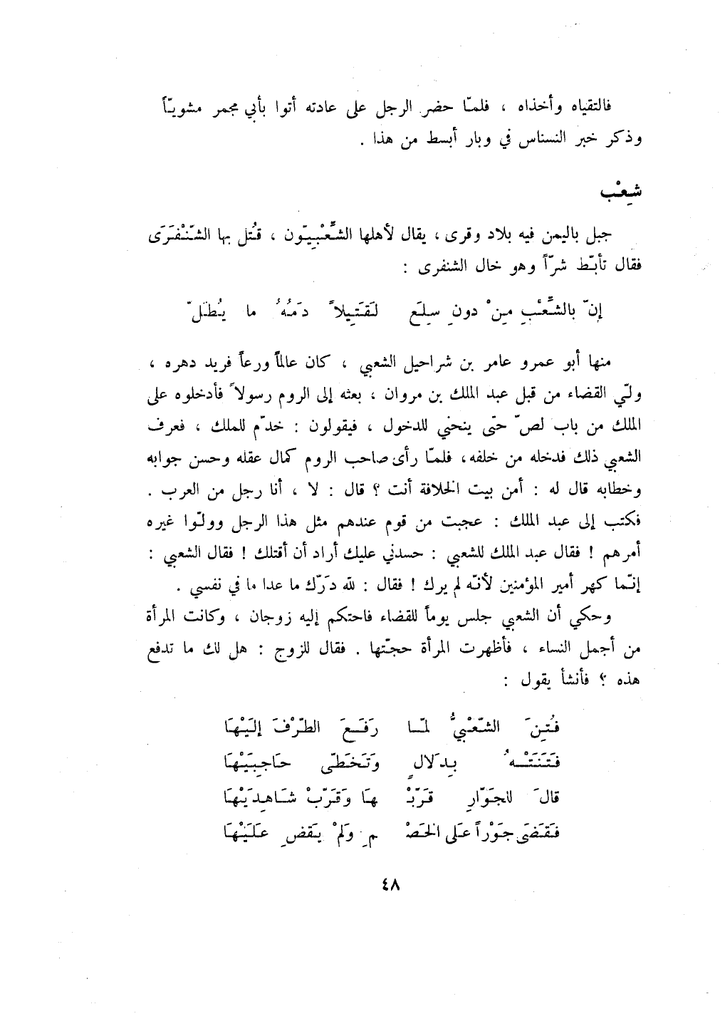 وحكي أن الشعبي جلس يوماً للقضاء فاحتكم إليه زوجان، وكانت المرأة من أجمل النساء، فأظهرت المرأة حجتها. فقال للزوج: هل لك ما تدفع هذه؟ فأنشأ يقول: