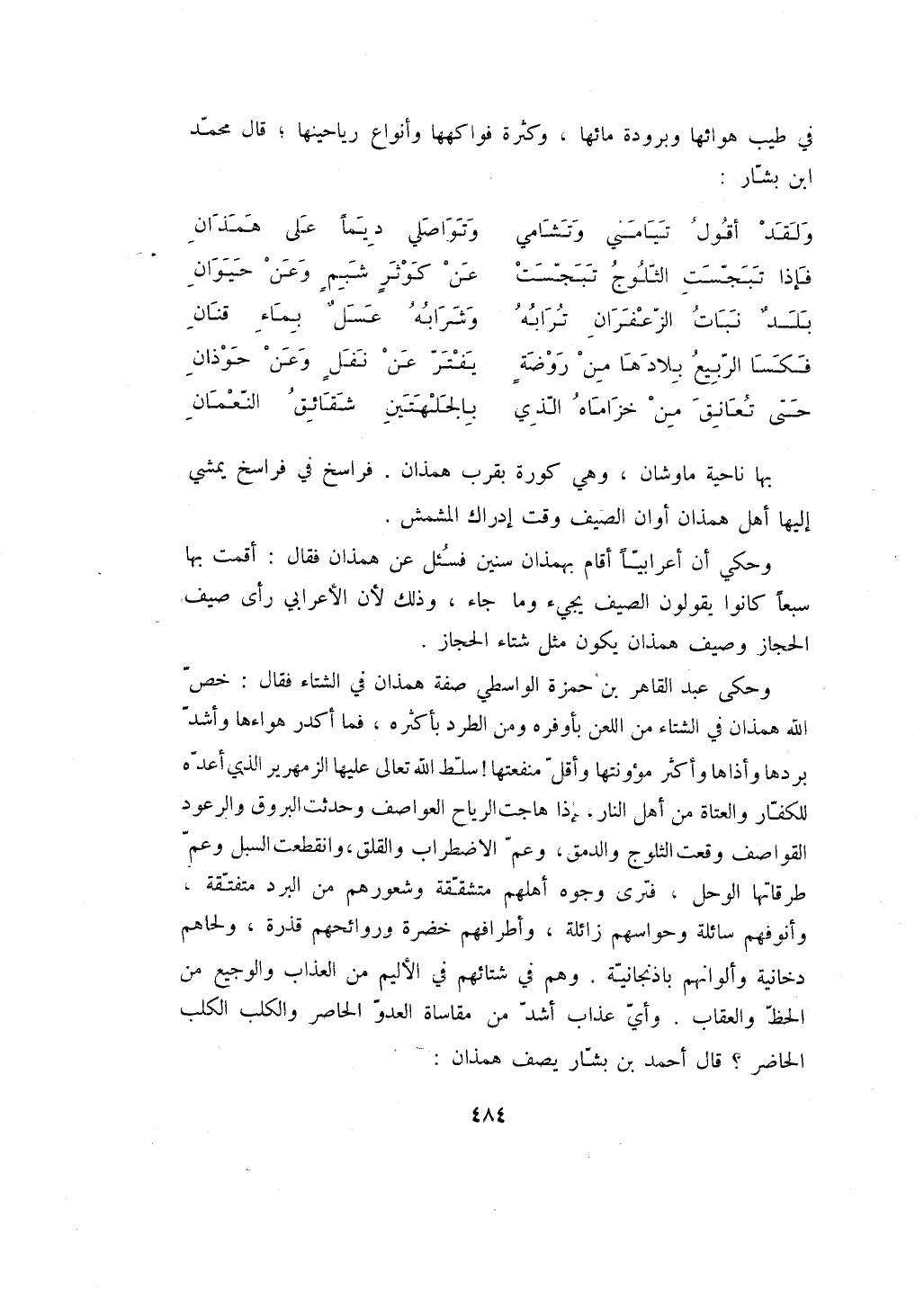 وحكي أن أعرابياً أقام بهمذان سنين فسئل عن همذان فقال: أقمت بها سبعاً كانوا يقولون الصيف يجيء وما جاء، وذلك لأن الأعرابي رأى صيف الحجاز وصيف همذان يكون مثل شتاء الحجاز.