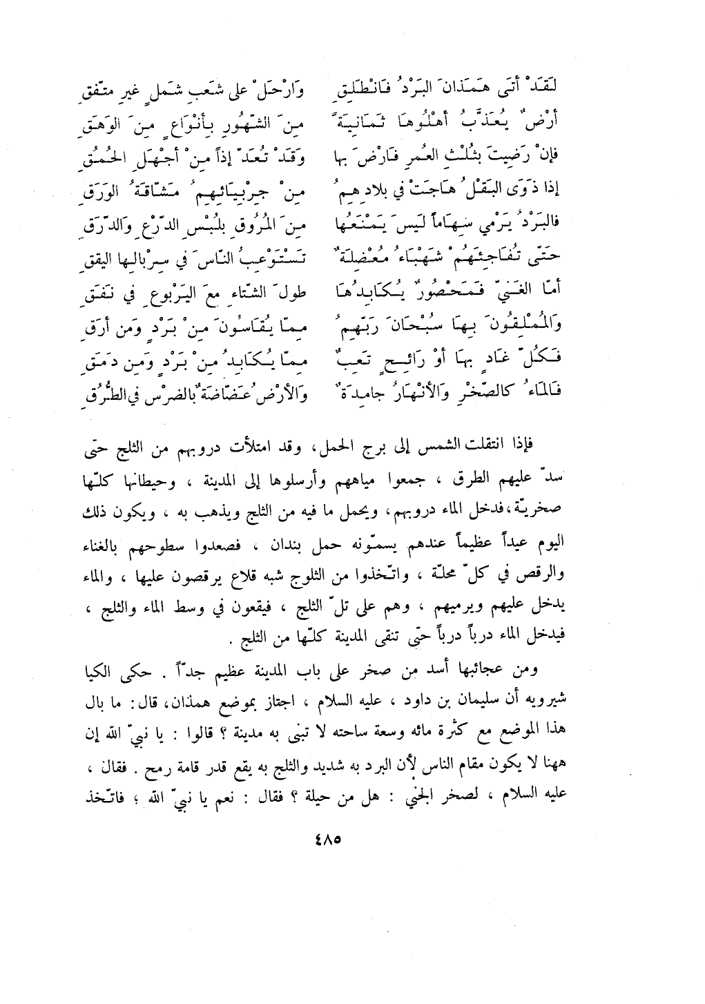 ومن عجائبها أسد من صخر على باب المدينة عظيم جداً. حكى الكيا شيرويه أن سليمان بن داود، عليه السلام، اجتاز بموضع همذان، قال: ما بال هذا الموضع مع كثرة مائه وسعة ساحته لا تبنى به مدينة؟ قالوا: يا نبي الله إن ههنا لا يكون مقام الناس لأن البرد به شديد والثلج به يقع قدر قامة رمح. فقال، عليه السلام، لصخر الجني: هل من حيلة؟ فقال: نعم يا نبي الله؛ فاتخذ