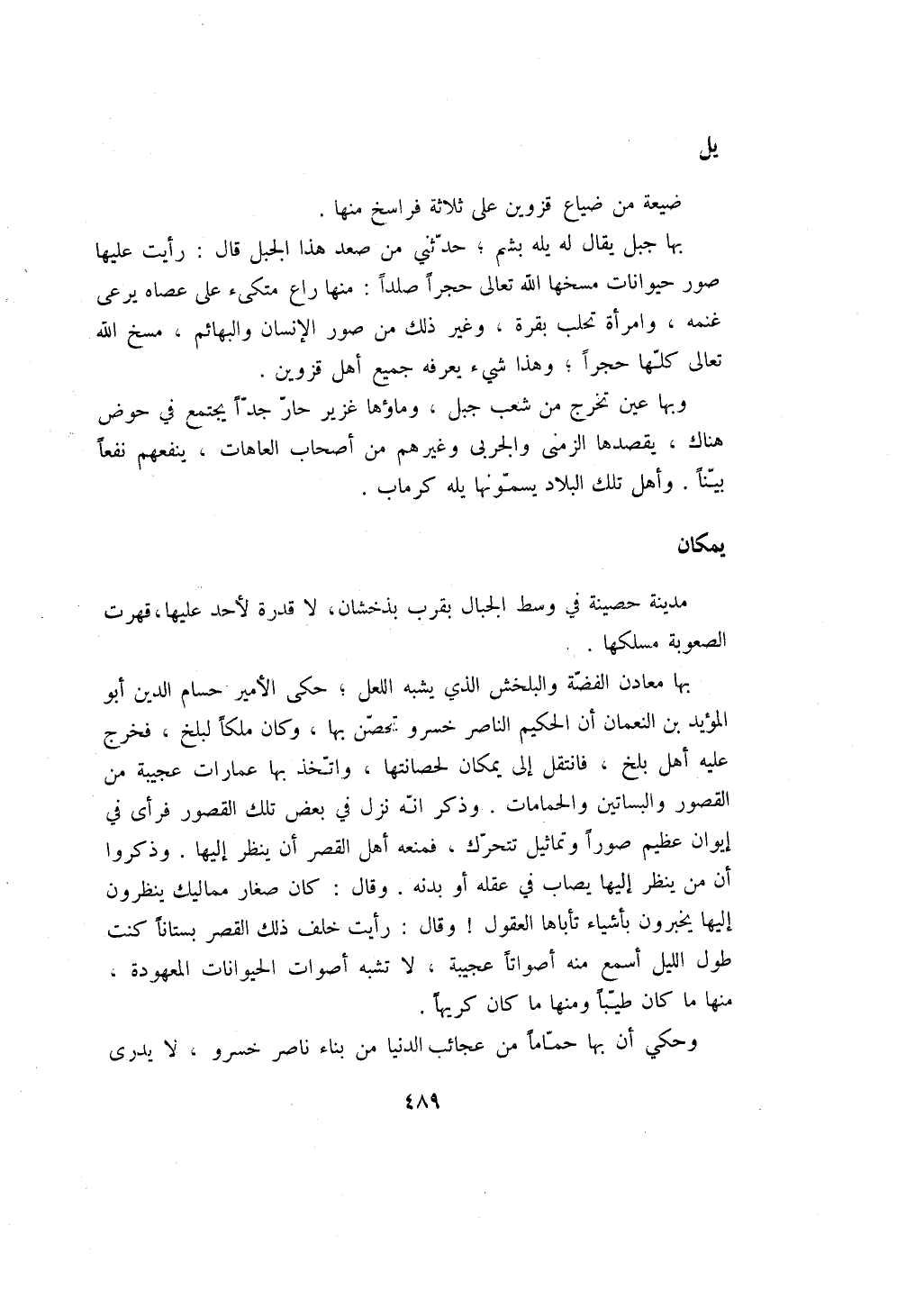بها معادن الفضة والبلخش الذي يشبه اللعل؛ حكى الأمير حسام الدين أبو المؤيد بن النعمان أن الحكيم الناصر خسرو تحصن بها، وكان ملكاً لبلخ، فخرج عليه أهل بلخ، فانتقل إلى يمكان لحصانتها، واتخذ بها عمارات عجيبة من القصور والبساتين والحمامات. وذكر انه نزل في بعض تلك القصور فرأى في إيوان عظيم صوراً وتماثيل تتحرك، فمنعه أهل القصر أن ينظر إليها. وذكروا أن من ينظر إليها يصاب في عقله أو بدنه. وقال: كان صغار مماليك ينظرون إليها يخبرون بأشياء تأباها العقول! وقال: رأيت خلف ذلك القصر بستاناً كنت طول الليل أسمع منه أصواتاً عجيبة، لا تشبه أصوات الحيوانات المعهودة، منها ما كان طيباً ومنها ما كان كريهاً.