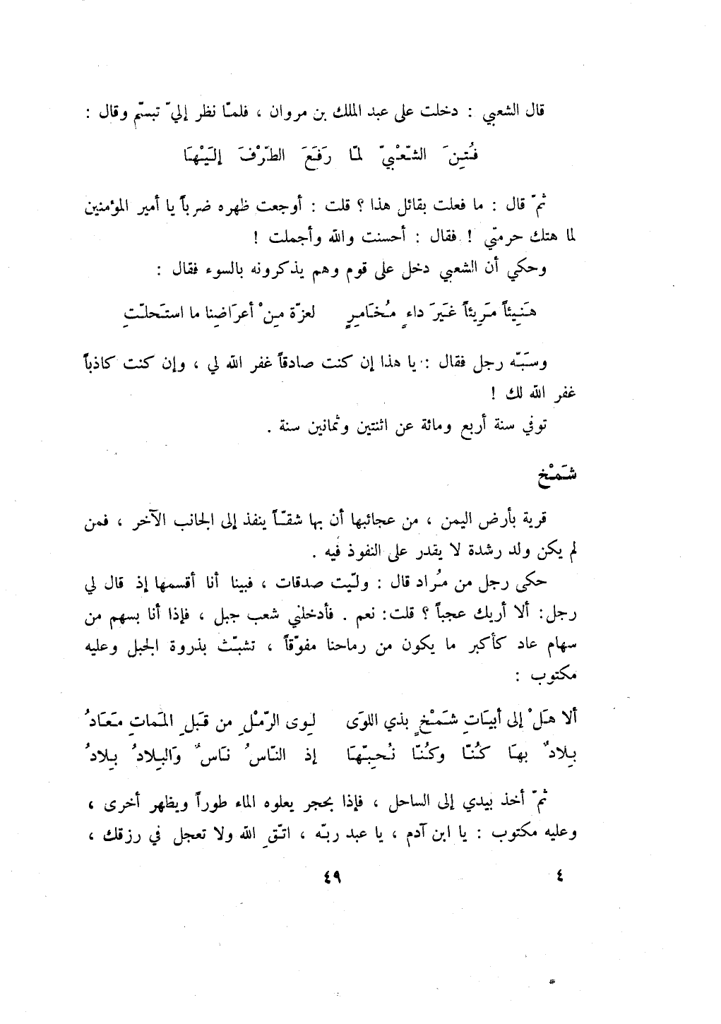 ثم قال: ما فعلت بقائل هذا؟ قلت: أوجعت ظهره ضرباً يا أمير المؤمنين لما هتك حرمتي! فقال: أحسنت والله وأجملت! وحكي أن الشعبي دخل على قوم وهم يذكرونه بالسوء فقال:
