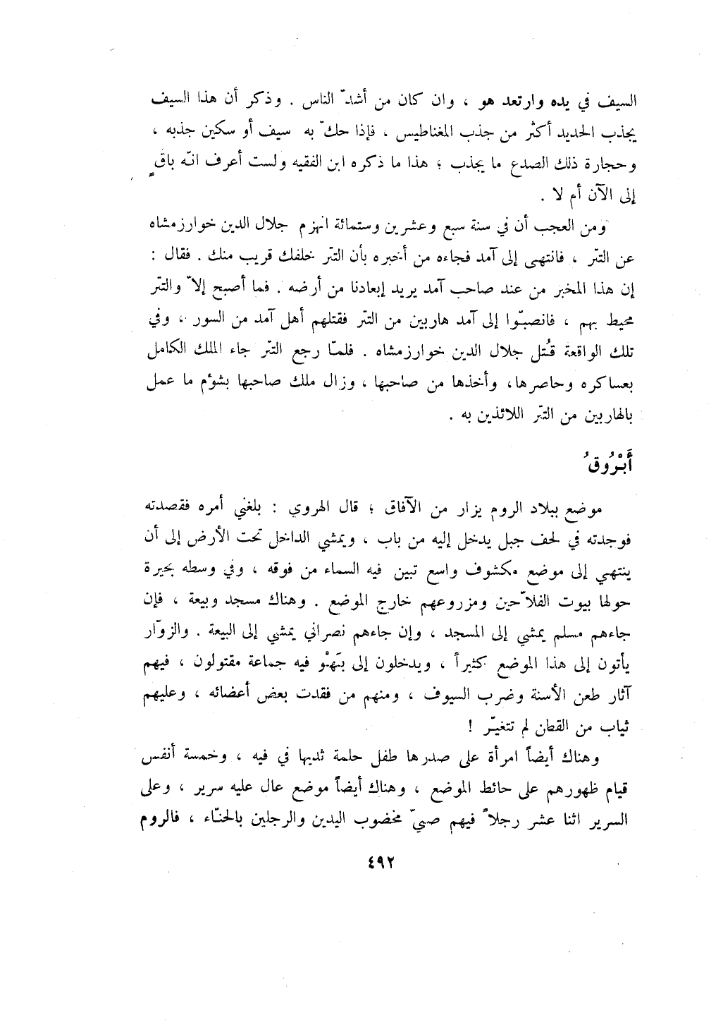 ومن العجب أن في سنة سبع وعشرين وستمائة انهزم جلال الدين خوارزمشاه عن التتر، فانتهى إلى آمد فجاءه من أخبره بأن التتر خلفك قريب منك. فقال: إن هذا المخبر من عند صاحب آمد يريد إبعادنا من أرضه. فما أصبح إلا والتتر محيط بهم، فانصبوا إلى آمد هاربين من التتر فقتلهم أهل آمد من السور، وفي تلك الواقعة قتل جلال الدين خوارزمشاه. فلما رجع التتر جاء الملك الكامل بعساكره وحاصرها، وأخذها من صاحبها، وزال ملك صاحبها بشؤم ما عمل بالهاربين من التتر اللائذين به.