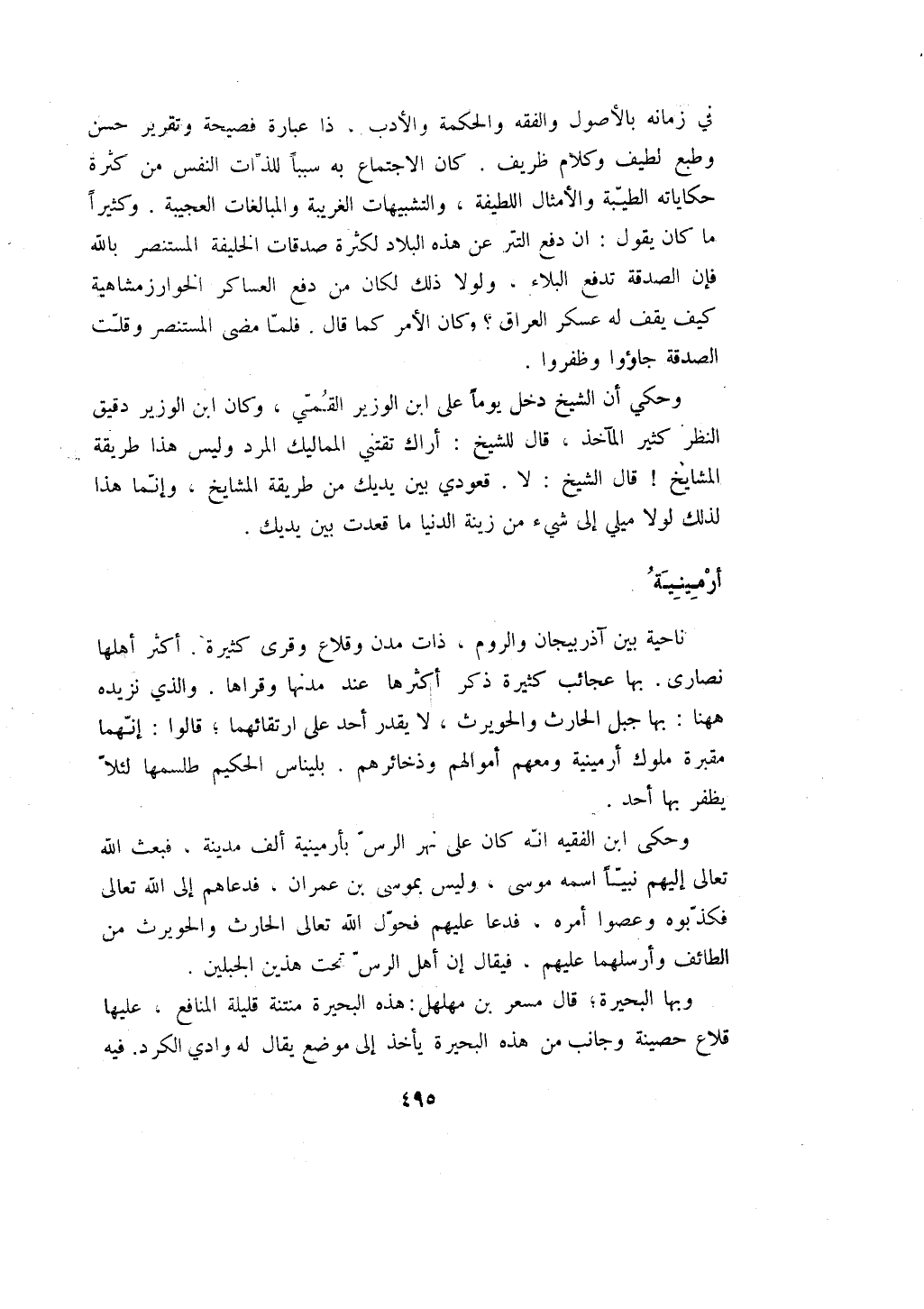 في زمانه بالأصول والفقه والحكمة والأدب، ذا عبارة فصيحة وتقرير حسن وطبع لطيف وكلام ظريف، كان الاجتماع به سبباً للذات النفس من كثرة حكاياته الطيبة والأمثال اللطيفة، والتشبيهات الغريبة والمبالغات العجيبة، وكثيراً ما كان يقول: ان دفع التتر عن هذه البلاد لكثرة صدقات الخليفة المستنصر بالله فإن الصدقة تدفع البلاء، ولولا ذلك لكان من دفع العساكر الخوارزمشاهية كيف يقف له عسكر العراق؟ وكان الأمر كما قال. فلما مضى المستنصر وقلت الصدقة جاؤوا وظفروا.