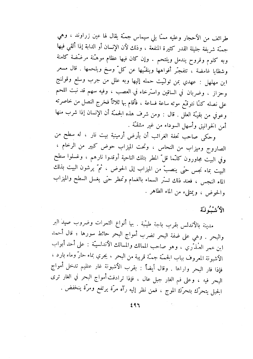 طرائف من الأحجار وعليه مما يلي سيماس جمة يقال لها عين زراوند، وهي جمة شريفة جليلة القدر كثيرة المنفعة، وذلك لأن الإنسان أو الدابة إذا ألقي فيها وبه كلوم وقروح يندمل ويلتحم، وإن كان فيها عظام موهنة مرضضة كامنة وشظايا غامضة، تتفجر أفواهها وينقيها عن كل وسخ ويلحمها. قال مسعر ابن مهلهل: عهدي بمن توليت حمله إليها وبه علل من جرب وسلع وقولنج وحزاز، وضربان في الساقين واسترخاء في العصب، وفيه سهم قد نبت اللحم على نصله كنا نتوقع موته ساعة فساعة، فأقام بها ثلاثاً فخرج النصل من خاصرته وعوفي من بقية العلل. قال: ومن شرف هذه الجمة أن الإنسان إذا شرب منها أمن الخوانيق وأسهل السوداء من غير مشقة.