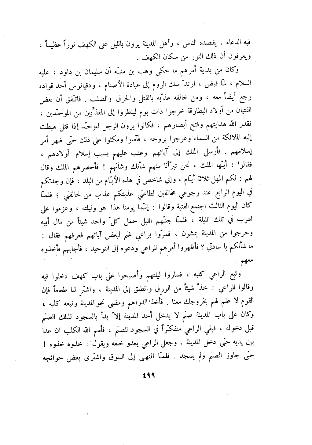 وكان من بداية أمرهم ما حكى وهب بن منبه أن سليمان بن داود، عليه السلام، لما قبض، ارتد ملك الروم إلى عبادة الأصنام، ودقيانوس أحد قواده رجع أيضاً معه، ومن خالفه عذبه بالقتل والحرق والصلب. فاتفق أن بعض الفتيان من أولاد البطارقة خرجوا ذات يوم لينظروا إلى المعذبين من الموحدين، فقدر الله هدايتهم وفتح أبصارهم، فكانوا يرون الرجل الموحد إذا قتل هبطت إليه الملائكة من السماء وعرجوا بروحه، فآمنوا ومكثوا على ذلك حتى ظهر أمر إسلامهم. فأرسل الملك إلى آبائهم وعتب عليهم بسبب إسلام أولادهم، فقالوا: أيها الملك، نحن تبرأنا منهم شأنك وشأنهم! فأحضرهم الملك وقال لهم: لكم المهل ثلاثة أيام، وإني شاخص في هذه الأيام من البلد، فإن وجدتكم في اليوم الرابع عند رجوعي مخالفين لطاعتي عذبتكم عذاب من خالفني؛ فلما كان اليوم الثالث اجتمع الفتية وقالوا: إنما يومنا هذا هو وليلته، وعزموا على الهرب في تلك الليلة، فلما جنهم الليل حمل كل واحد شيئاً من مال أبيه وخرجوا من المدينة يمشون، فمروا براعي غنم لبعض آبائهم فعرفهم فقال: ما شأنكم يا سادتي؟ فأظهروا أمرهم للراعي ودعوه إلى التوحيد، فأجابهم فأخذوه معهم.