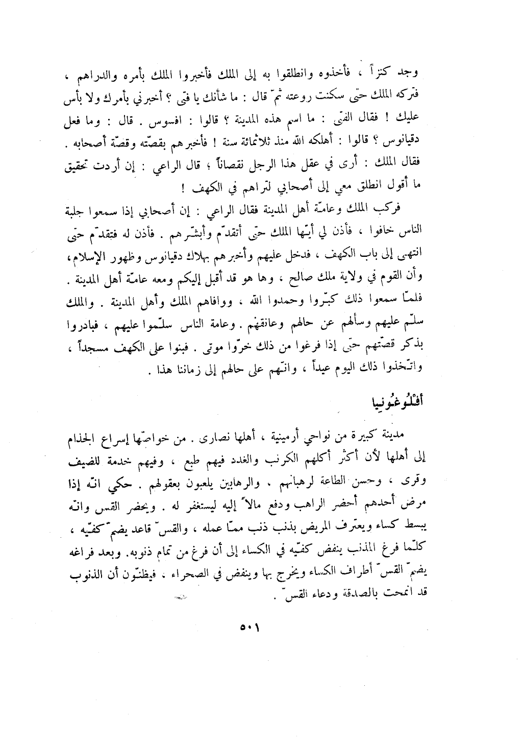 وجد كنزاً، فأخذوه وانطلقوا به إلى الملك فأخبروا الملك بأمره والدراهم، فتركه الملك حتى سكنت روعته ثم قال: ما شأنك يا فتى؟ أخبرني بأمرك ولا بأس عليك! فقال الفتى: ما اسم هذه المدينة؟ قالوا: افسوس. قال: وما فعل دقيانوس؟ قالوا: أهلكه الله منذ ثلاثمائة سنة! فأخبرهم بقصته وقصة أصحابه. فقال الملك: أرى في عقل هذا الرجل نقصاناً؛ قال الراعي: إن أردت تحقيق ما أقول انطلق معي إلى أصحابي لتراهم في الكهف! فركب الملك وعامة أهل المدينة فقال الراعي: إن أصحابي إذا سمعوا جلبة الناس خافوا، فأذن لي أيها الملك حتى أتقدم وأبشرهم. فأذن له فتقدم حتى انتهى إلى باب الكهف، فدخل عليهم وأخبرهم بهلاك دقيانوس وظهور الإسلام، وأن القوم في ولاية ملك صالح، وها هو قد أقبل إليكم ومعه عامة أهل المدينة. فلما سمعوا ذلك كبروا وحمدوا الله، ووافاهم الملك وأهل المدينة. والملك سلم عليهم وسألهم عن حالهم وعانقهم. وعامة الناس سلموا عليهم، فبادروا بذكر قصتهم حتى إذا فرغوا من ذلك خروا موتى. فبنوا على الكهف مسجداً، واتخذوا ذلك اليوم عيداً، وانهم على حالهم إلى زماننا هذا.