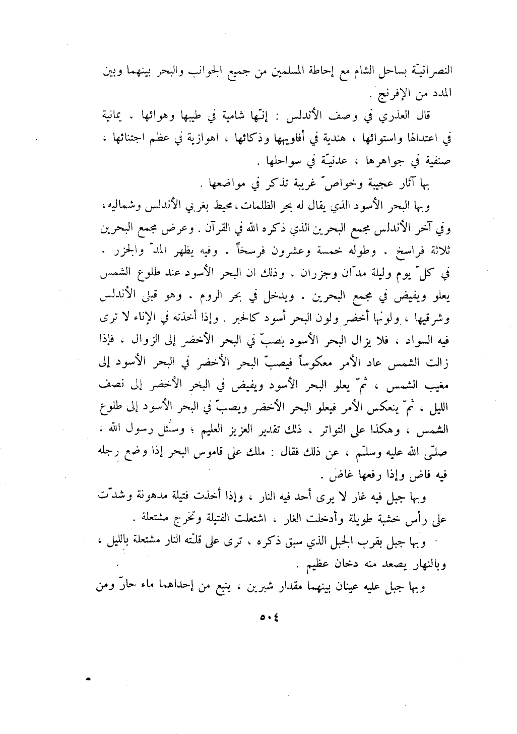 وبها البحر الأسود الذي يقال له بحر الظلمات، محيط بغربي الأندلس وشماليه، وفي آخر الأندلس مجمع البحرين الذي ذكره الله في القرآن. وعرض مجمع البحرين ثلاثة فراسخ، وطوله خمسة وعشرون فرسخاً، وفيه يظهر المد والجزر، في كل يوم وليلة مدان وجزران، وذلك ان البحر الأسود عند طلوع الشمس يعلو ويفيض في مجمع البحرين، ويدخل في بحر الروم، وهو قبلى الأندلس وشرقيها، ولونها أخضر ولون البحر أسود كالحبر. وإذا أخذته في الإناء لا ترى فيه السواد، فلا يزال البحر الأسود يصب في البحر الأخضر إلى الزوال، فإذا زالت الشمس عاد الأمر معكوساً فيصب البحر الأخضر في البحر الأسود إلى مغيب الشمس، ثم يعلو البحر الأسود ويفيض في البحر الأخضر إلى نصف الليل، ثم ينعكس الأمر فيعلو البحر الأخضر ويصب في البحر الأسود إلى طلوع الشمس، وهكذا على التواتر، ذلك تقدير العزيز العليم؛ وسئل رسول الله، صلى الله عليه وسلم، عن ذلك فقال: ملك على قاموس البحر إذا وضع رجله فيه فاض وإذا رفعها غاض.