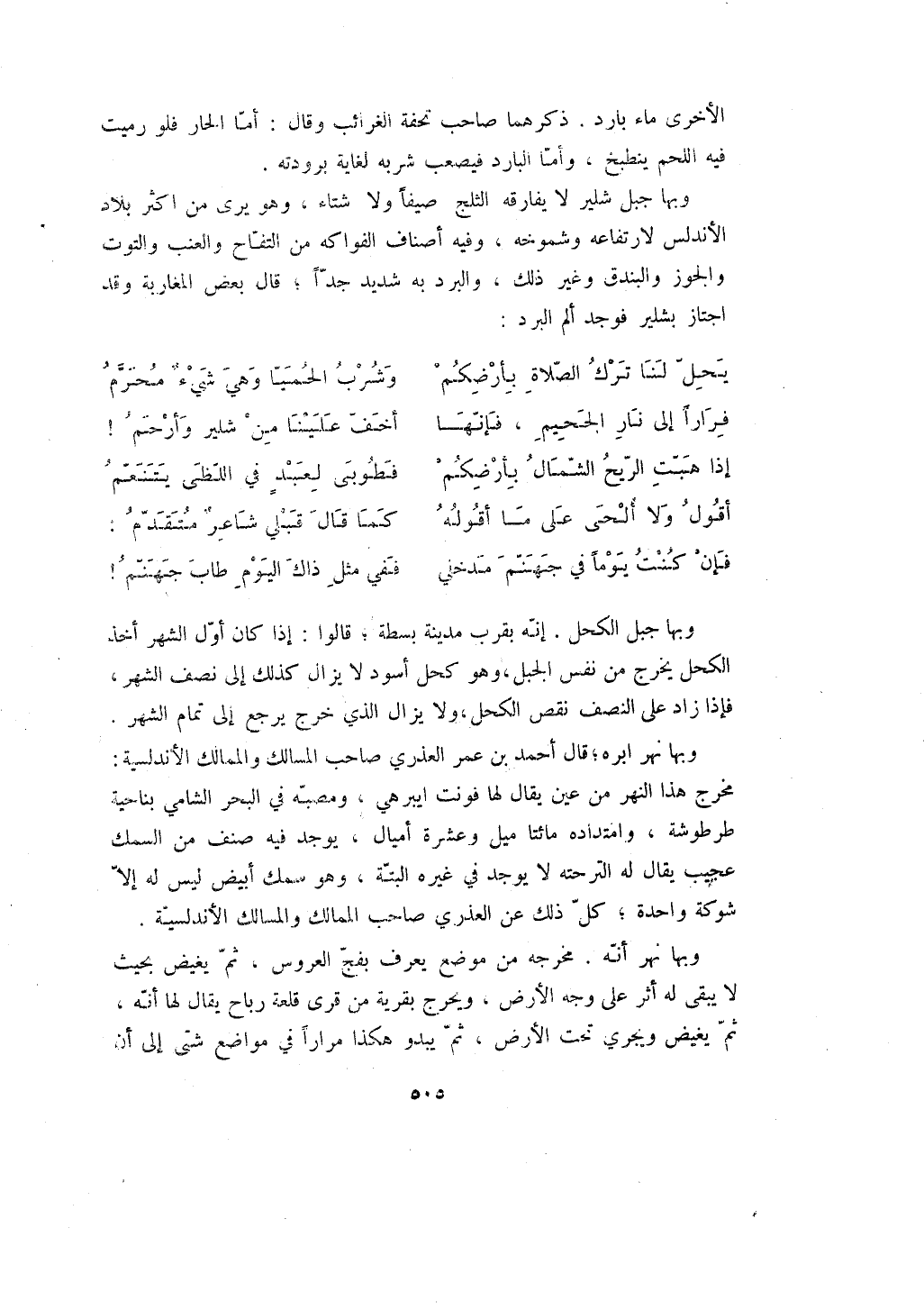 الأخرى ماء بارد. ذكرهما صاحب تحفة الغرائب وقال: أما الحارث فلو رميت فيه اللحم ينطبخ، وأما البارد فيصعب شربه لغاية برودته.