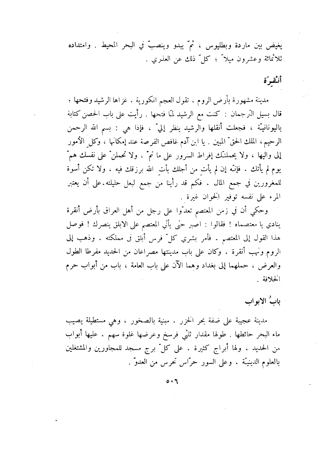 مدينة مشهورة بأرض الروم، تقول العجم انكورية، غزاها الرشيد وفتحها؛ قال بسيل الترجمان: كنت مع الرشيد لما فتحها. رأيت على باب الحصن كتابة باليونانية، فجعلت أنقلها والرشيد ينظر إلي، فإذا هي: بسم الله الرحمن الرحيم، الملك الحق المبين. يا ابن آدم غافص الفرصة عند إمكانها، وكل الأمور إلى واليها، ولا يحملنك إفراط السرور على ما تم، ولا تحملن على نفسك هم يوم لم يأتك، فإنه إن لم يأت من أجلك يأت الله برزقك فيه، ولا تكن أسوة للمغرورين في جمع المال، فكم قد رأينا من جمع لبعل حليلته، على أن يعتبر المرء على نفسه توفير الخوان غيرة.