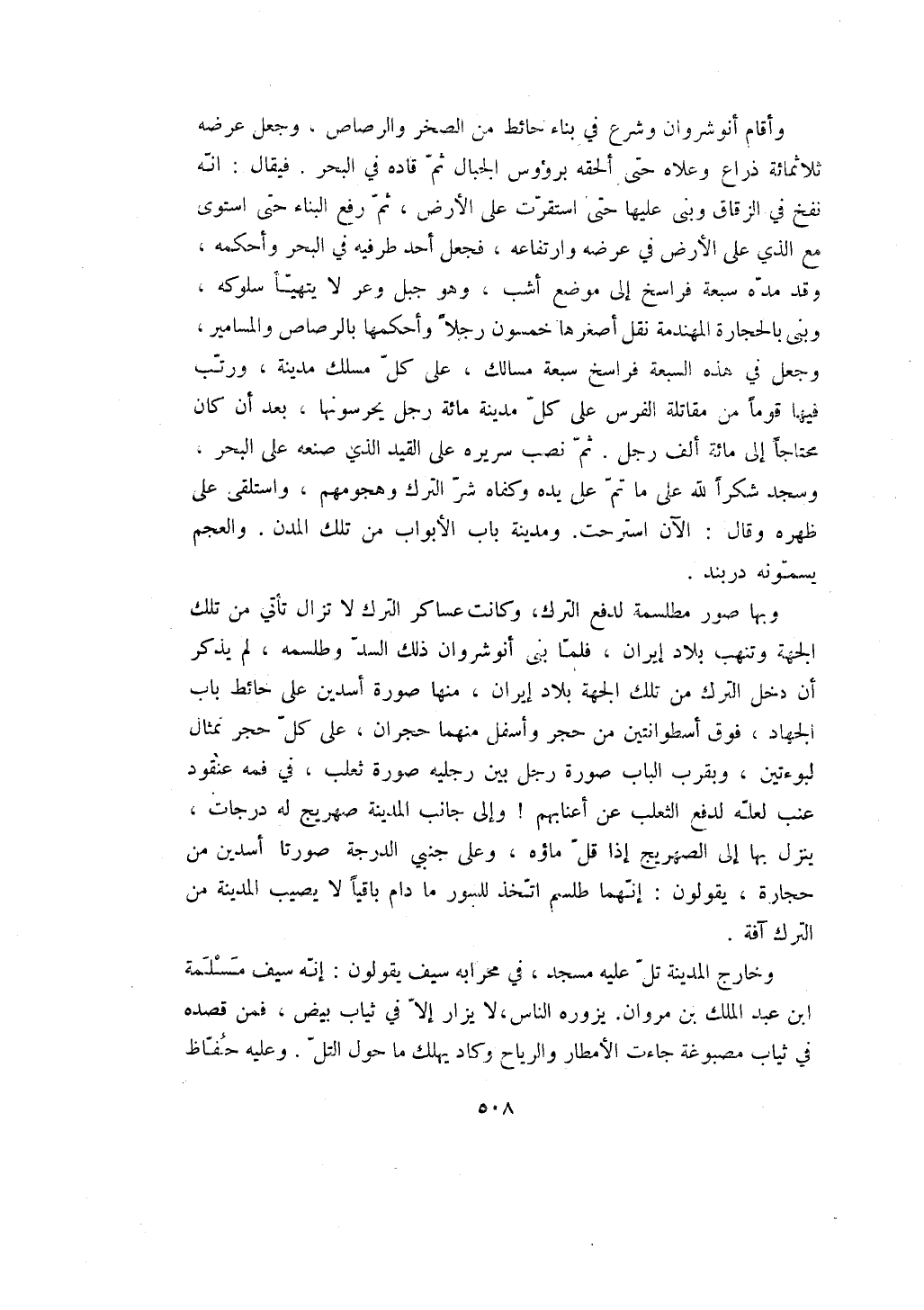 وأقام أنوشروان وشرع في بناء حائط من الصخر والرصاص، وجعل عرضه ثلاثمائة ذراع وعلاه حتى ألحقه برؤوس الجبال ثم قاده في البحر. فيقال: انه نفخ في الزقاق وبنى عليها حتى استقرت على الأرض، ثم رفع البناء حتى استوى مع الذي على الأرض في عرضه وارتفاعه، فجعل أحد طرفيه في البحر وأحكمه، وقد مده سبعة فراسخ إلى موضع أشب، وهو جبل وعر لا يتهيأ سلوكه، وبنى بالحجارة المهندمة نقل أصغرها خمسون رجلاً وأحكمها بالرصاص والمسامير، وجعل في هذه السبعة فراسخ سبعة مسالك، على كل مسلك مدينة، ورتب فيها قوماً من مقاتلة الفرس على كل مدينة مائة رجل يحرسونها، بعد أن كان محتاجاً إلى مائة ألف رجل. ثم نصب سريره على القيد الذي صنعه على البحر، وسجد شكراً لله على ما تم على يده وكفاه شر الترك وهجومهم، واستلقى على ظهره وقال: الآن استرحت. ومدينة باب الأبواب من تلك المدن. والعجم يسمونه دربند.