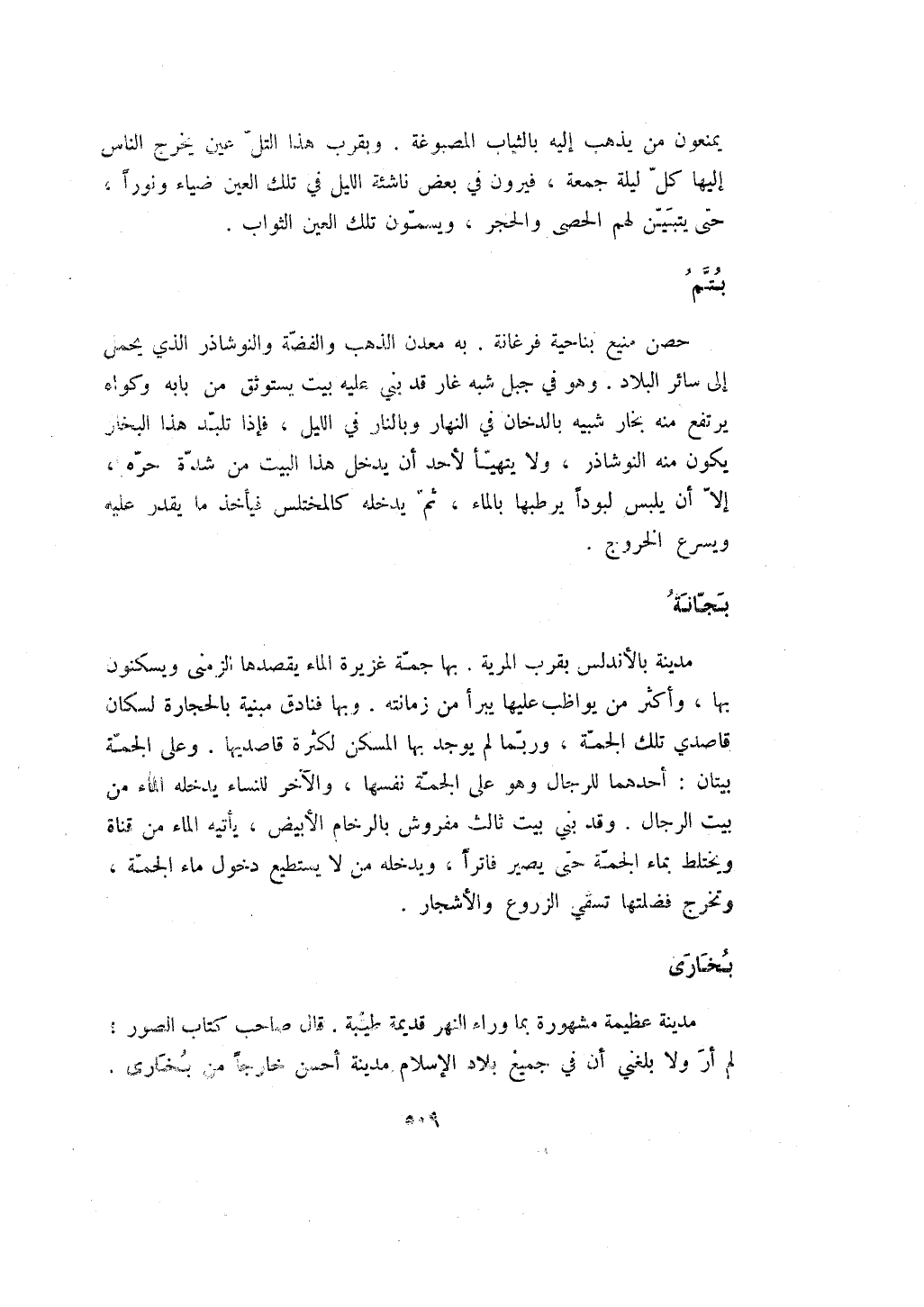 مدينة عظيمة مشهورة بما وراء النهر قديمة طيبة. قال صاحب كتاب الصور: لم أر ولا بلغني أن في جميع بلاد الإسلام مدينة أحسن خارجاً من بخارى.