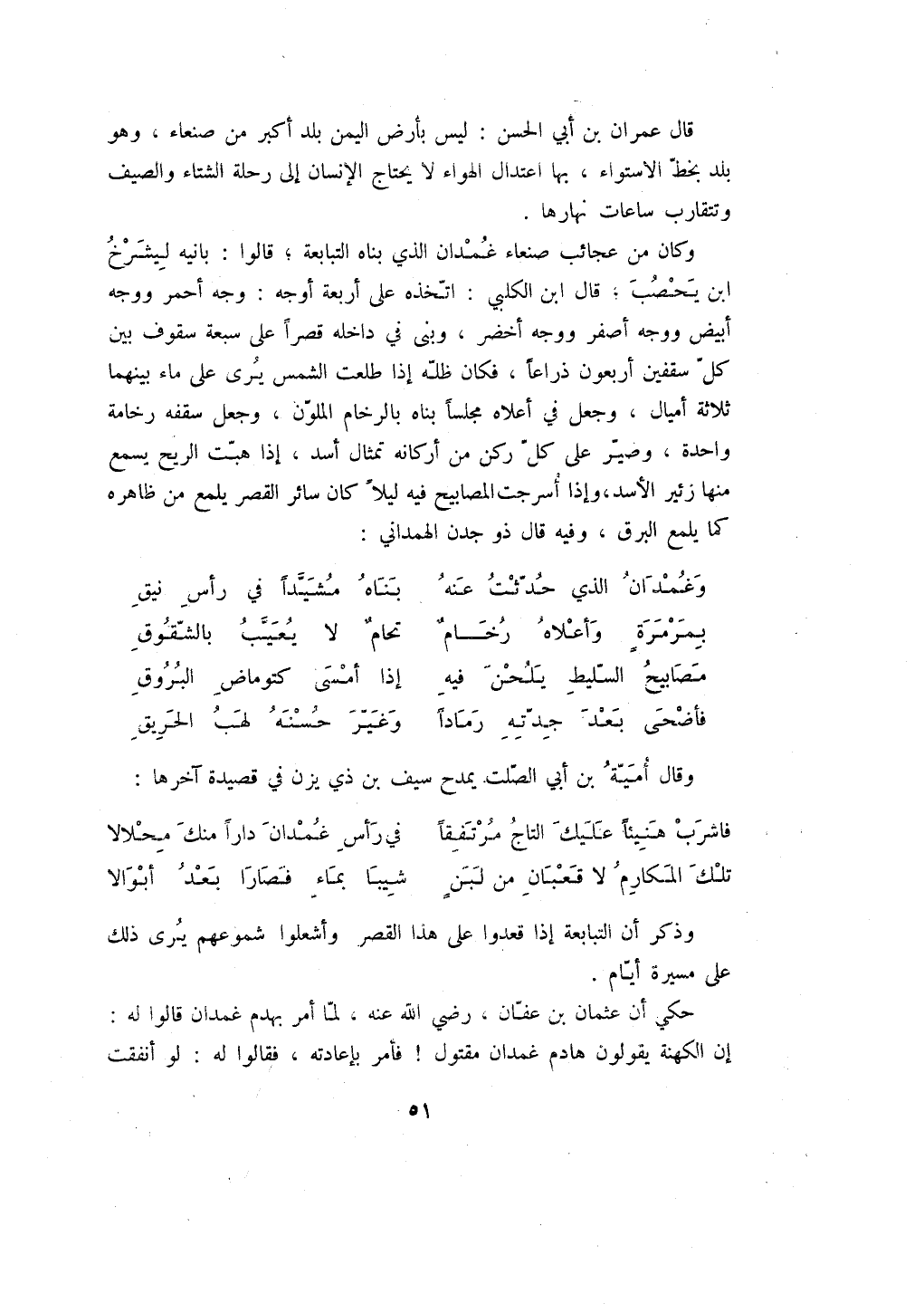 قال عمران بن أبي الحسن: ليس بأرض اليمن بلد أكبر من صنعاء، وهو بلد بخط الاستواء، بها اعتدال الهواء لا يحتاج الإنسان إلى رحلة الشتاء والصيف وتتقارب ساعات نهارها.
