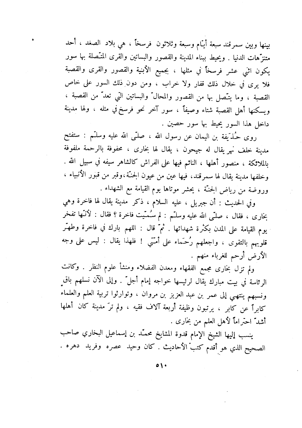 ولم تزل بخارى مجمع الفقهاء ومعدن الفضلاء ومنشأ علوم النظر. وكانت الرئاسة في بيت مبارك يقال لرئيسها خواجه إمام أجل. وإلى الآن نسلهم باق ونسبهم ينتهي إلى عمر بن عبد العزيز بن مروان، وتوارثوا تربية العلم والعلماء كابراً عن كابر، يرتبون وظيفة أربعة آلاف فقيه، ولم تر مدينة كان أهلها أشد احتراماً لأهل العلم من بخارى.