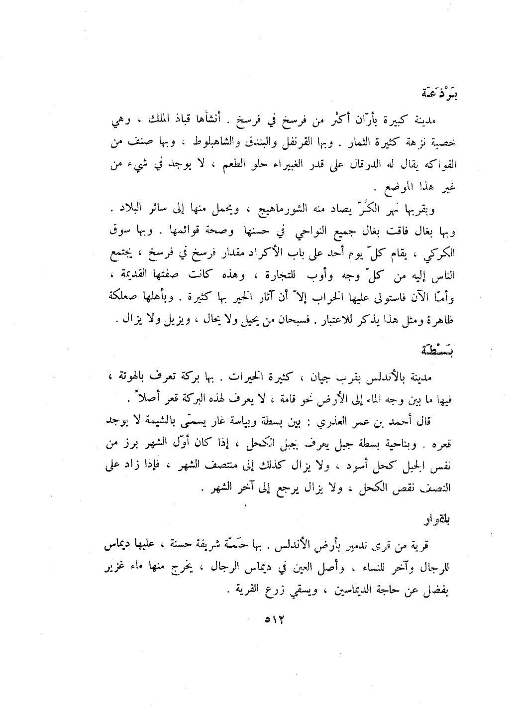 وبقربها نهر الكر يصاد منه الشورماهيج، ويحمل منها إلى سائر البلاد. وبها بغال فاقت بغال جميع النواحي في حسنها وصحة قوائمها. وبها سوق الكركي، يقام كل يوم أحد على باب الأكراد مقدار فرسخ في فرسخ، يجتمع الناس إليه من كل وجه وأوب للتجارة، وهذه كانت صفتها القديمة، وأما الآن فاستولى عليها الخراب إلا أن آثار الخير بها كثيرة. وبأهلها صعلكة ظاهرة ومثل هذا يذكر للاعتبار. فسبحان من يحيل ولا يحال، ويزيل ولا يزال.