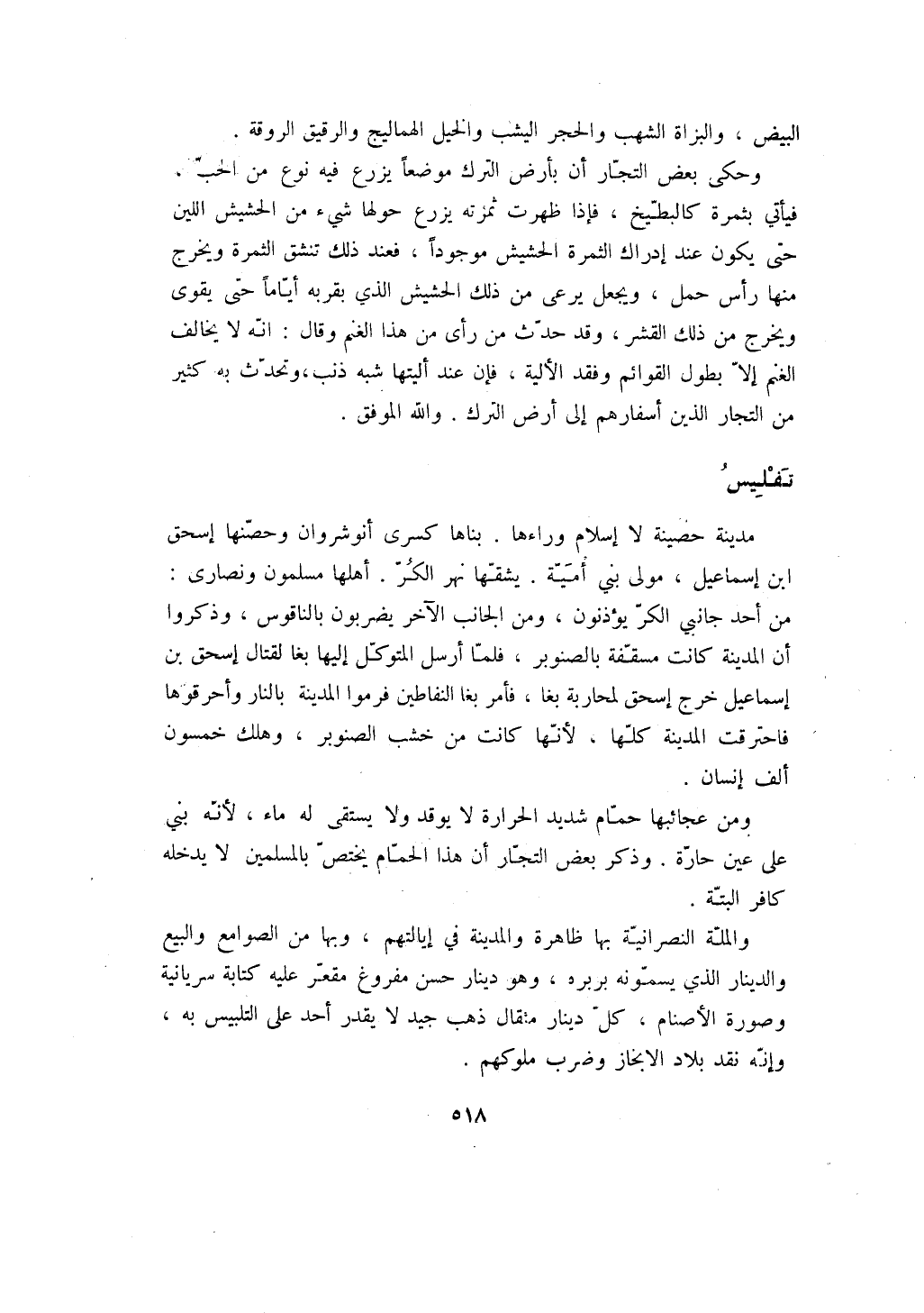 وحكى بعض التجار أن بأرض الترك موضعاً يزرع فيه نوع من الحب، فيأتي بثمرة كالبطيخ، فإذا ظهرت ثمرته يزرع حولها شيء من الحشيش اللين حتى يكون عند إدراك الثمرة الحشيش موجوداً، فعند ذلك تنشق الثمرة ويخرج منها رأس حمل، ويجعل يرعى من ذلك الحشيش الذي بقربه أياماً حتى يقوى ويخرج من ذلك القشر، وقد حدث من رأى من هذا الغنم وقال: انه لا يخالف الغنم إلا بطول القوائم وفقد الألية، فإن عند أليتها شبه ذنب، وتحدث به كثير من التجار الذين أسفارهم إلى أرض الترك. والله الموفق.