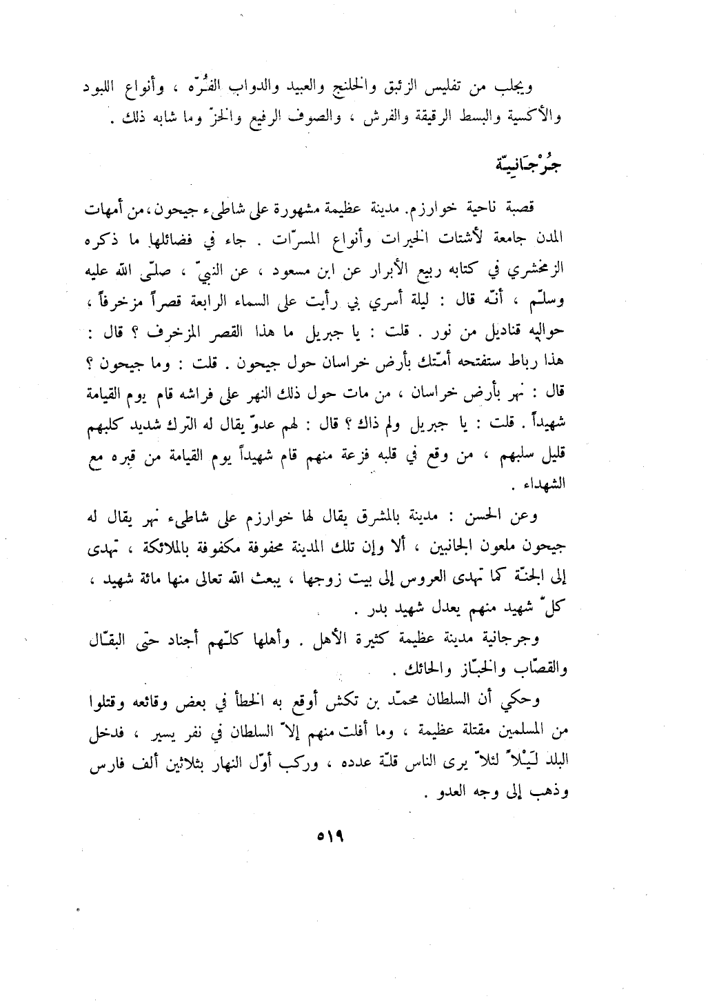 وعن الحسن: مدينة بالمشرق يقال لها خوارزم على شاطيء نهر يقال له جيحون ملعون الجانبين، ألا وإن تلك المدينة محفوفة مكفوفة بالملائكة، تهدى إلى الجنة كما تهدى العروس إلى بيت زوجها، يبعث الله تعالى منها مائة شهيد، كل شهيد منهم يعدل شهيد بدر.