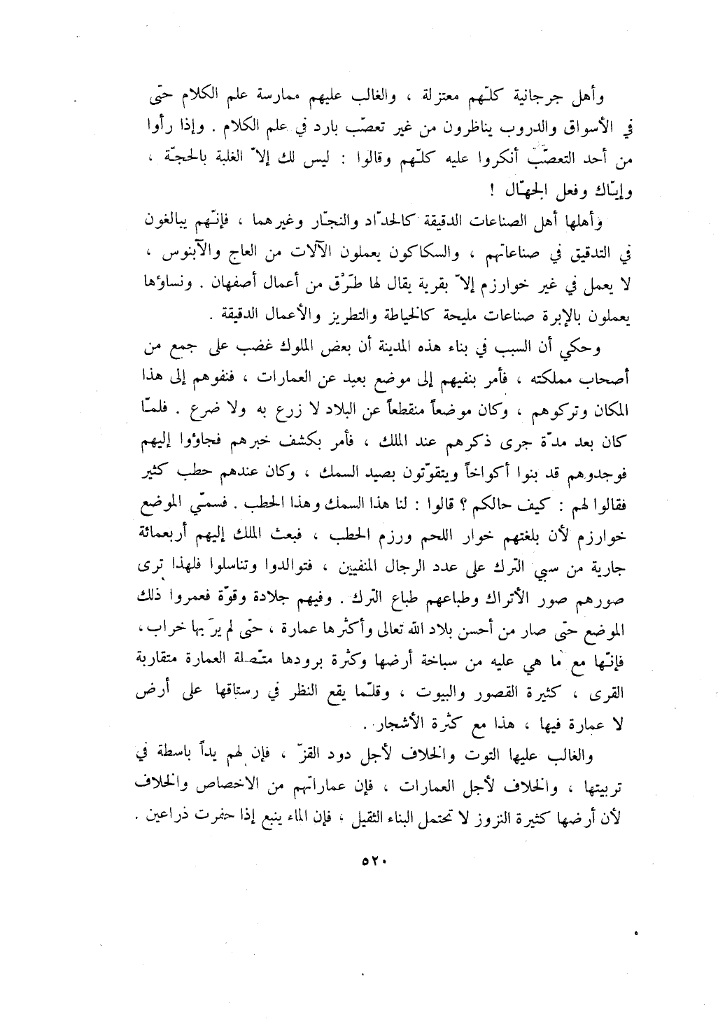 وأهل جرجانية كلهم معتزلة، والغالب عليهم ممارسة علم الكلام حتى في الأسواق والدروب يناظرون من غير تعصب بارد في علم الكلام. وإذا رأوا من أحد التعصب أنكروا عليه كلهم وقالوا: ليس لك إلا الغلبة بالحجة، وإياك وفعل الجهال! وأهلها أهل الصناعات الدقيقة كالحداد والنجار وغيرهما، فإنهم يبالغون في التدقيق في صناعاتهم، والسكاكون يعملون الآلات من العاج والآبنوس، لا يعمل في غير خوارزم إلا بقرية يقال لها طرق من أعمال أصفهان. ونساؤها يعملون بالإبرة صناعات مليحة كالخياطة والتطريز والأعمال الدقيقة.