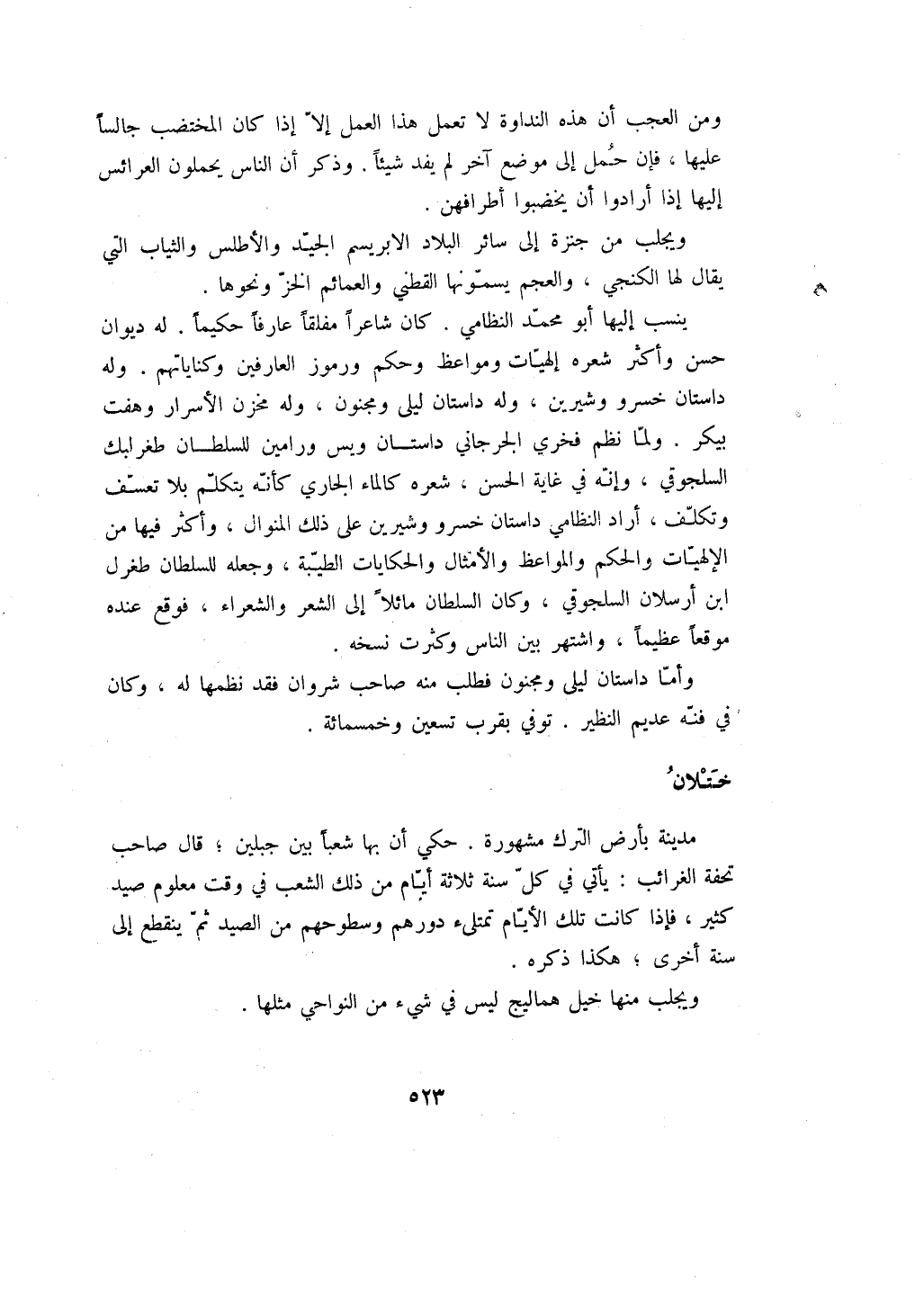 وأما داستان ليلى ومجنون فطلب منه صاحب شروان فقد نظمها له، وكان في فنه عديم النظير. توفي بقرب تسعين وخمسمائة.