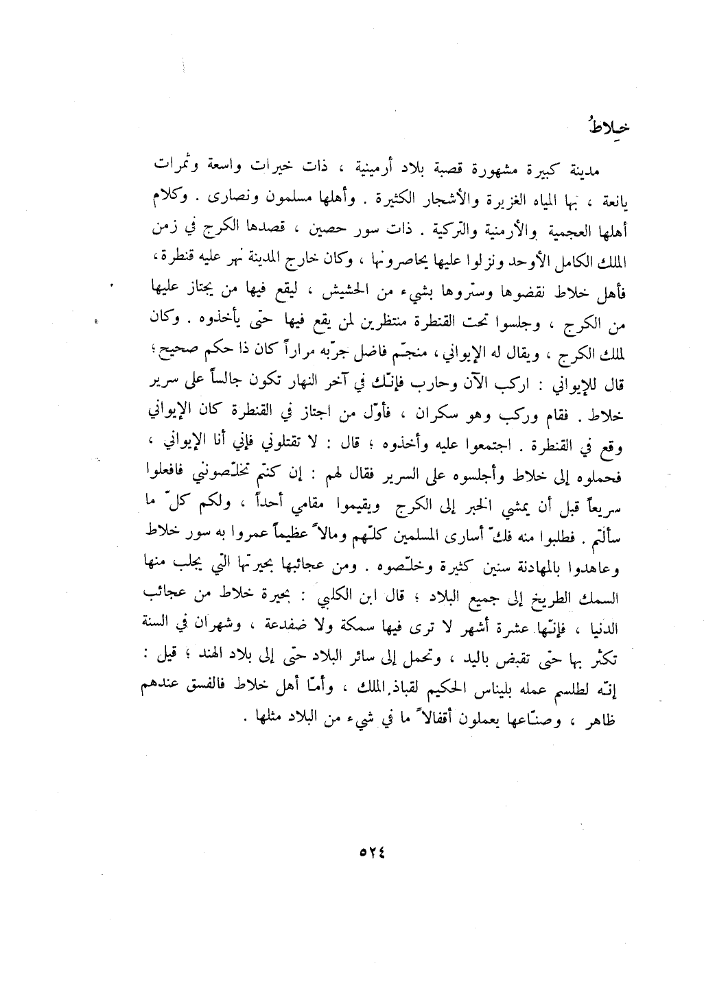 مدينة كبيرة مشهورة قصبة بلاد أرمينية، ذات خيرات واسعة وثمرات يانعة، بها المياه الغزيرة والأشجار الكثيرة. وأهلها مسلمون ونصارى. وكلام أهلها العجمية والأرمنية والتركية. ذات سور حصين، قصدها الكرج في زمن الملك الكامل الأوحد ونزلوا عليها يحاصرونها، وكان خارج المدينة نهر عليه قنطرة، فأهل خلاط نقضوها وستروها بشيء من الحشيش، ليقع فيها من يجتاز عليها من الكرج، وجلسوا تحت القنطرة منتظرين لمن يقع فيها حتى يأخذوه. وكان لملك الكرج، ويقال له الإيواني، منجم فاضل جربه مراراً كان ذا حكم صحيح؛ قال للإيواني: اركب الآن وحارب فإنك في آخر النهار تكون جالساً على سرير خلاط. فقام وركب وهو سكران، فأول من اجتاز في القنطرة كان الإيواني وقع في القنطرة. اجتمعوا عليه وأخذوه؛ قال: لا تقتلوني فإني أنا الإيواني، فحملوه إلى خلاط وأجلسوه على السرير فقال لهم: إن كنتم تخلصونني فافعلوا سريعاً قبل أن يمشي الخبر إلى الكرج ويقيموا مقامي أحداً، ولكم كل ما سألتم. فطلبوا منه فك أسارى المسلمين كلهم ومالاً عظيماً عمروا به سور خلاط وعاهدوا بالمهادنة سنين كثيرة وخلصوه. ومن عجائبها بحيرتها التي يجلب منها السمك الطريخ إلى جميع البلاد؛ قال ابن الكلبي: بحيرة خلاط من عجائب الدنيا، فإنها عشرة أشهر لا ترى فيها سمكة ولا ضفدعة، وشهران في السنة تكثر بها حتى تقبض باليد، وتحمل إلى سائر البلاد حتى إلى بلاد الهند؛ قيل: إنه لطلسم عمله بليناس الحكيم لقباذ الملك، وأما أهل خلاط فالفسق عندهم ظاهر، وصناعها يعملون أقفالاً ما في شيء من البلاد مثلها.