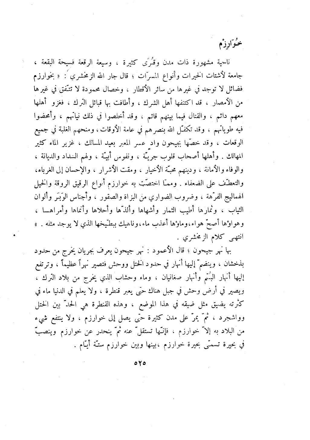 ناحية مشهورة ذات مدن وقرى كثيرة، وسيعة الرقعة فسيحة البقعة، جامعة لأشتات الخيرات وأنواع المسرات؛ قال جار الله الزمخشري: بخوارزم فضائل لا توجد في غيرها من سائر الأقطار، وخصال محمودة لا تتفق في غيرها من الأمصار، قد اكتنفها أهل الشرك، وأطافت بها قبائل الترك، فغزو أهلها معهم دائم، والقتال فيما بينهم قائم، وقد أخلصوا في ذلك نياتهم، وأمحضوا فيه طوياتهم، وقد تكفل الله بنصرهم في عامة الأوقات، ومنحهم الغلبة في جميع الوقعات، وقد خصها بجيحون واد عسر المعبر بعيد المسالك، غزير الماء كثير المهالك. وأهلها أصحاب قلوب جرية، ونفوس أبية، ولهم السداد والديانة، والوفاء والأمانة، ودينهم محبة الأخيار، ومقت الأشرار، والإحسان إلى الغرباء، والتعطف على الضعفاء. ومما اختصت به خوارزم أنواع الرقيق الروقة والخيل الهماليج الفرهة، وضروب الضواري من البزاة والصقور، وأجناس الوبر وألوان الثياب، وثمارها أطيب الثمار وأشهاها وألذها وأحلاها وأنماها وأمراها، وهواؤها أصح هواء، وماؤها أعذب ماء، وناهيك ببطيخها الذي لا يوجد مثله. انتهى كلام الزمخشري.