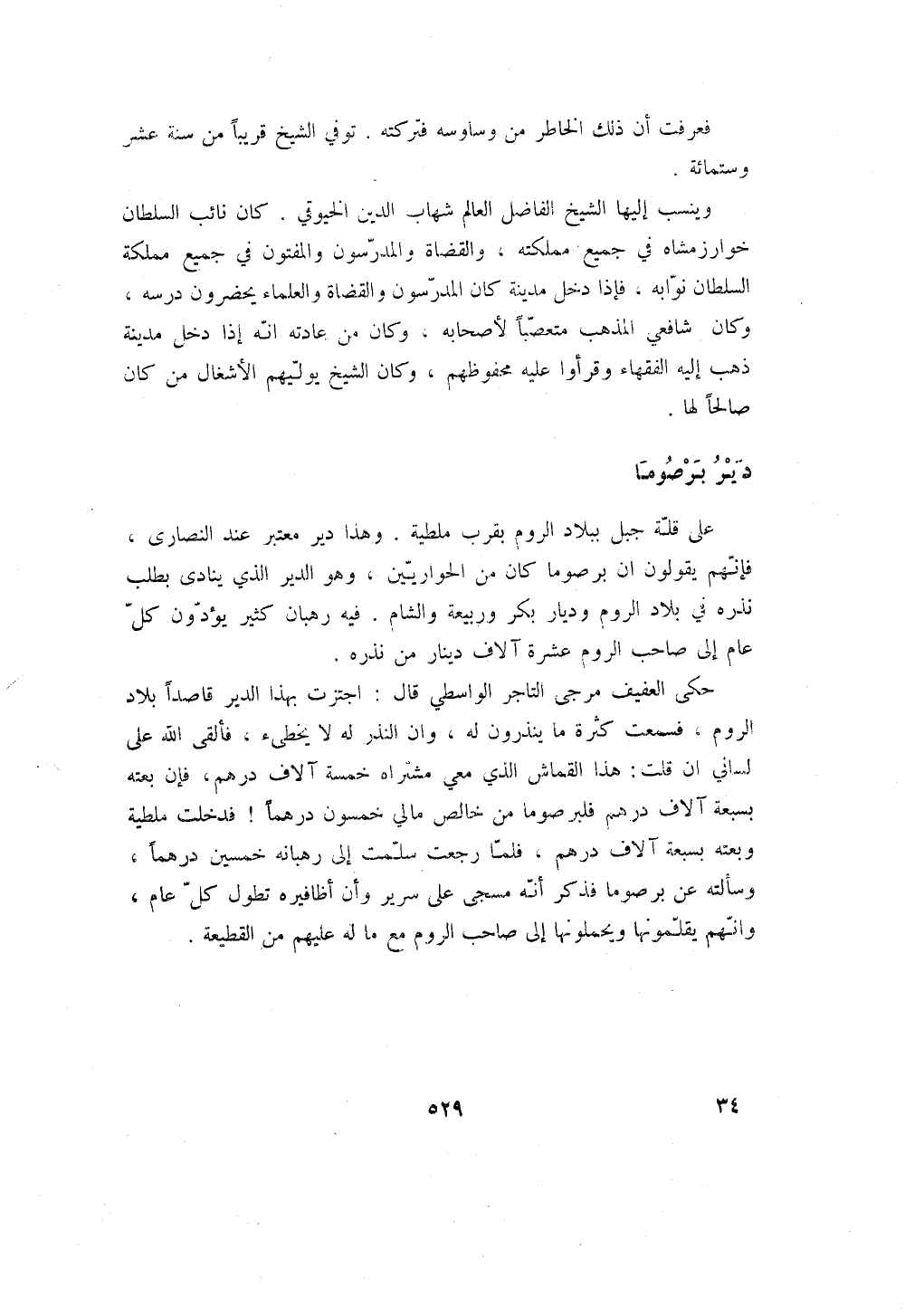 حكى العفيف مرجى التاجر الواسطي قال: اجتزت بهذا الدير قاصداً بلاد الروم، فسمعت كثرة ما ينذرون له، وان النذر له لا يخطيء، فألقى الله على لساني ان قلت: هذا القماش الذي معي مشتراه خمسة آلاف درهم، فإن بعته بسبعة آلاف درهم فلبرصوما من خالص مالي خمسون درهماً! فدخلت ملطية وبعته بسبعة آلاف درهم، فلما رجعت سلمت إلى رهبانه خمسين درهماً، وسألته عن برصوما فذكر أنه مسجى على سرير وأن أظافيره تطول كل عام، وانهم يقلمونها ويحملونها إلى صاحب الروم مع ما له عليهم من القطيعة.