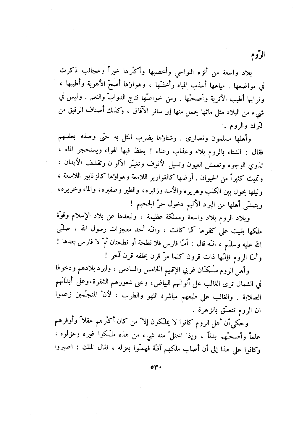 وأهلها مسلمون ونصارى. وشتاؤها يضرب المثل به حتى وصفه بعضهم فقال: الشتاء بالروم بلاء وعذاب وعناء! يغلظ فيها الهواء ويستحجر الماء، تذوي الوجوه وتعمش العيون وتسيل الأنوف وتغير الألوان وتقشف الأبدان، وتميت كثيراً من الحيوان. أرضها كالقوارير اللامعة وهواؤها كالزنابير اللاسعة، وليلها يحول بين الكلب وهريره والأسد وزئيره، والطير وصفيره، والماء وخريره، ويتمنى أهلها من البرد الأليم دخول حر الجحيم! وبلاد الروم بلاد واسعة ومملكة عظيمة، ولبعدها عن بلاد الإسلام وقوة ملكها بقيت على كفرها كما كانت، وانه أحد معجزات رسول الله، صلى الله عليه وسلم، انه قال: أما فارس فلا نطحة أو نطحتان ثم لا فارس بعدها! وأما الروم فإنها ذات قرون كلما مر قرن يخلفه قرن آخر! وأهل الروم سكان غربي الإقليم الخامس والسادس، ولبرد بلادهم ودخولها في الشمال ترى الغالب على ألوانهم البياض، وعلى شعورهم الشقرة، وعلى أبدانهم الصلابة. والغالب على طبعهم مباشرة اللهو والطرب، لأن المنجمين زعموا ان الروم تتعلق بالزهرة.