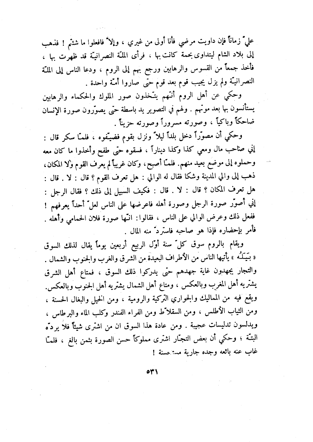 علي زماناً فإن داويت مرضي فأنا أولى من غيري، وإلا فافعلوا ما شئتم! فذهب إلى بلاد الشام ليتداوى بحمة كانت بها، فرأى الملة النصرانية قد ظهرت بها، فأخذ جمعاً من القسوس والرهابين ورجع بهم إلى الروم، ودعا الناس إلى الملة النصرانية ولم يزل يجيب قوم بعد قوم حتى صاروا أمة واحدة.
