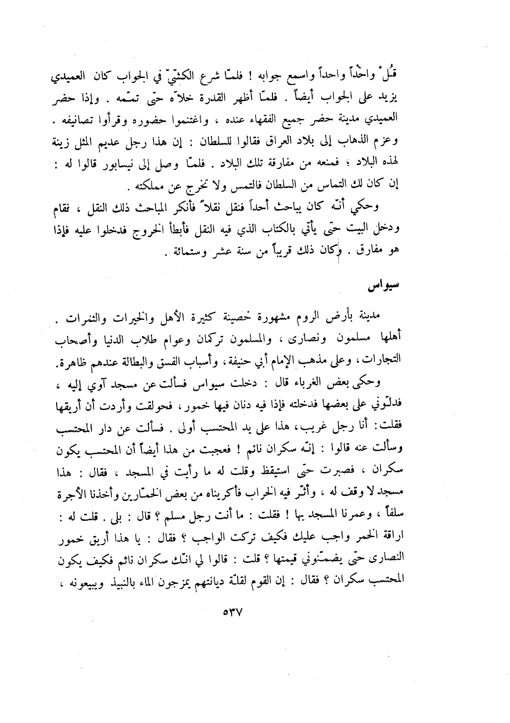 وحكى بعض الغرباء قال: دخلت سيواس فسألت عن مسجد آوي إليه، فدلوني على بعضها فدخلته فإذا فيه دنان فيها خمور، فحولقت وأردت أن أريقها فقلت: أنا رجل غريب، هذا على يد المحتسب أولى. فسألت عن دار المحتسب وسألت عنه قالوا: إنه سكران نائم! فعجبت من هذا أيضاً أن المحتسب يكون سكران، فصبرت حتى استيقظ وقلت له ما رأيت في المسجد، فقال: هذا مسجد لا وقف له، وأثر فيه الخراب فأكريناه من بعض الخمارين وأخذنا الأجرة سلفاً، وعمرنا المسجد بها! فقلت: ما أنت رجل مسلم؟ قال: بلى. قلت له: اراقة الخمر واجب عليك فكيف تركت الواجب؟ فقال: يا هذا أريق خمور النصارى حتى يضمنوني قيمتها؟ قلت: قالوا لي انك سكران نائم فكيف يكون المحتسب سكران؟ فقال: إن القوم لقلة ديانتهم يمزجون الماء بالنبيذ ويبيعونه،