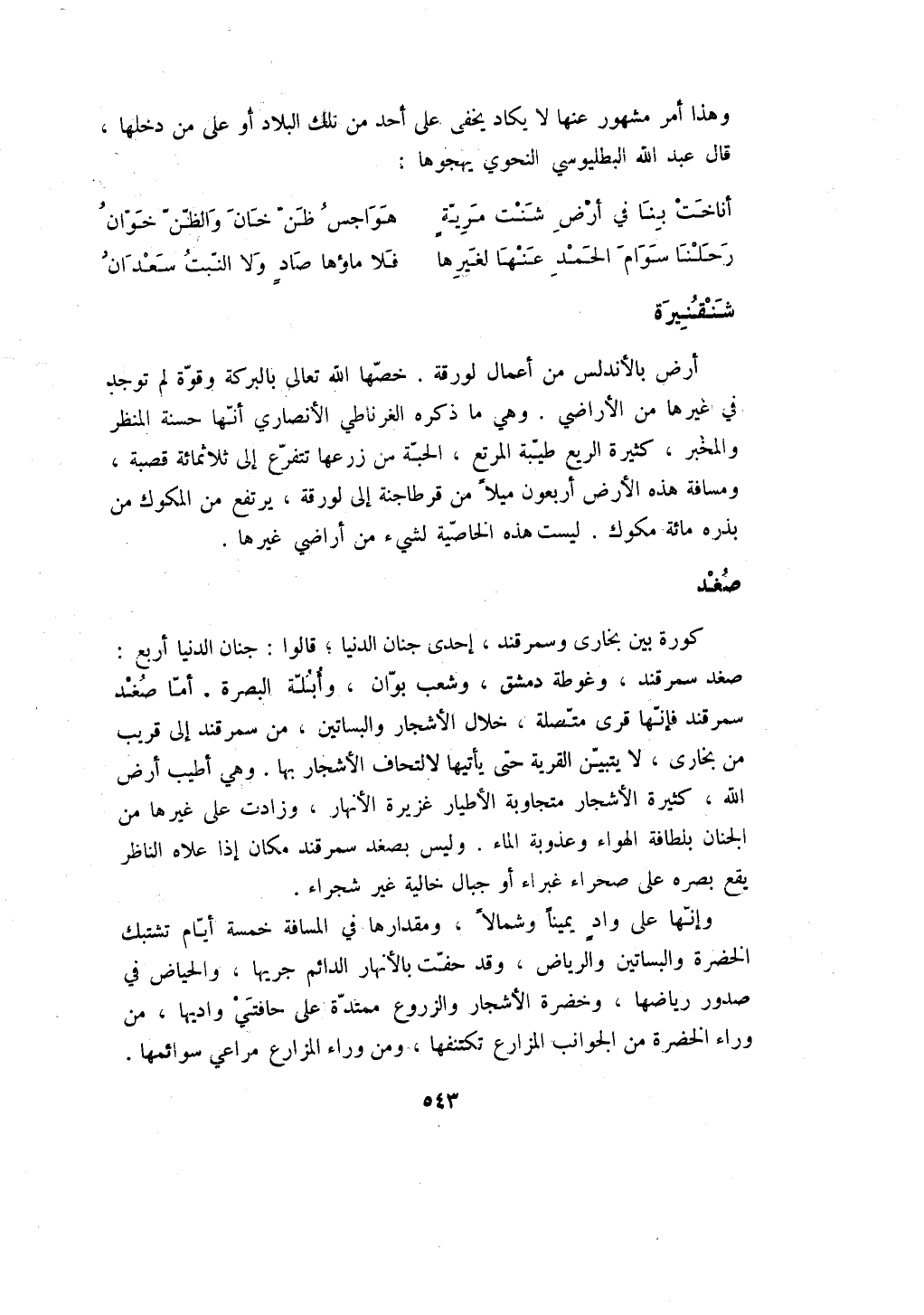 كورة بين بخارى وسمرقند، إحدى جنان الدنيا؛ قالوا: جنان الدنيا أربع: صغد سمرقند، وغوطة دمشق، وشعب بوان، وأبلة البصرة. أما صغد سمرقند فإنها قرى متصلة، خلال الأشجار والبساتين، من سمرقند إلى قريب من بخارى، لا يتبين القرية حتى يأتيها لالتحاف الأشجار بها. وهي أطيب أرض الله، كثيرة الأشجار متجاوبة الأطيار غزيرة الأنهار، وزادت على غيرها من الجنان بلطافة الهواء وعذوبة الماء. وليس بصغد سمرقند مكان إذا علاه الناظر يقع بصره على صحراء غبراء أو جبال خالية غير شجراء.